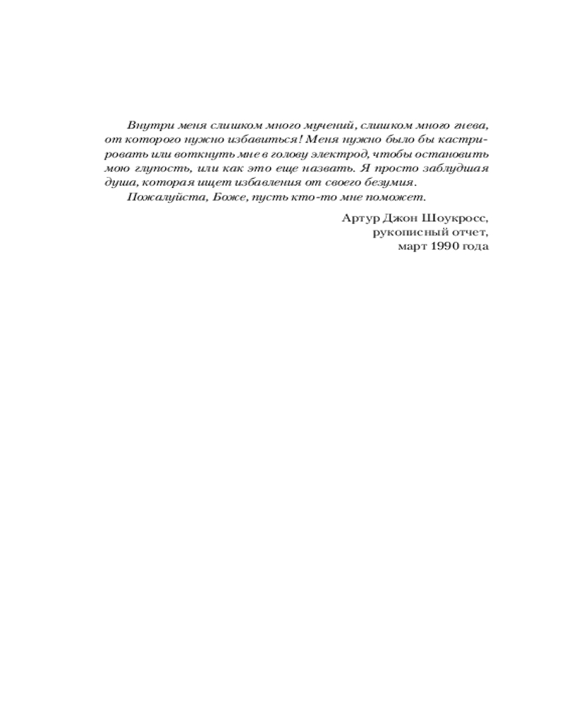 Серия: Tok. True Crime Story. Главный документальный триллер года Полная история маньяка Артура Шоукросса — самого парадоксального серийного убийцы, лишившего жизни сначала мальчика и девочку, а потом более десяти взрослых женщин. Одним он казался монстром без надежды на исправление. Другие видели в нем проблемного юношу, которому можно помочь.