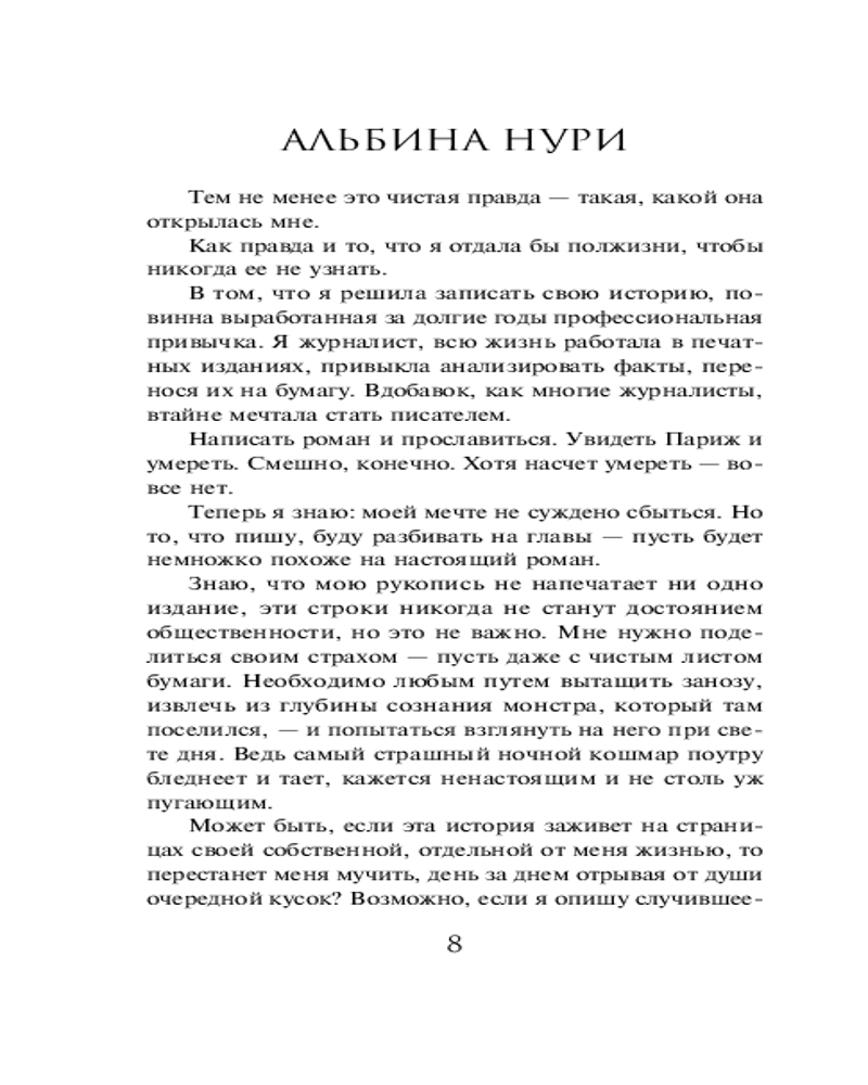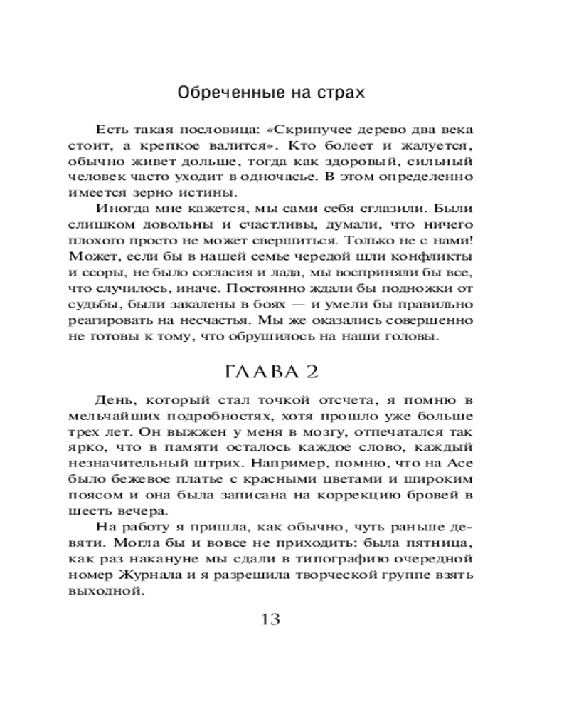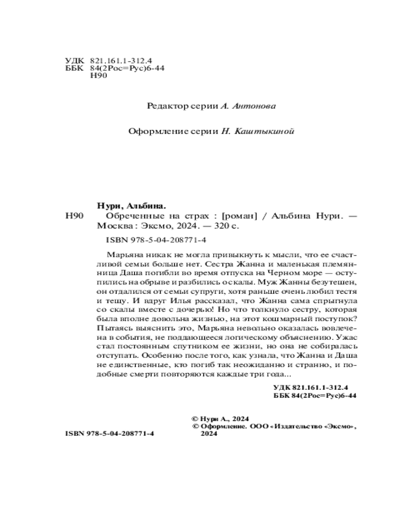 💳 Оплатить за товар можно при получении 🇰🇿 Есть бесплатная доставка по Казахстану от 1 дня 🎁 Копите бонусы с каждой покупки Серия: За гранью реальности. Мистические триллеры Альбины Нури (обложка) Марьяна никак не могла привыкнуть к мысли, что ее счастливой семьи больше нет. Сестра Жанна и маленькая племянница Даша погибли во время отпуска на Черном море — оступились на обрыве и разбились о скалы. Муж Жанны безутешен, он отдалился от семьи супруги, хотя раньше очень любил тестя и тещу. И вдруг Илья рассказал, что Жанна сама спрыгнула со скалы вместе с дочерью! Но что толкнуло сестру, которая была вполне довольна жизнью, на этот кошмарный поступок? Пытаясь выяснить это, Марьяна невольно оказалась вовлечена в события, не поддающееся логическому объяснению. Ужас стал постоянным спутником ее жизни, но она не собиралась отступать. Особенно после того, как узнала, что Жанна и Даша не единственные, кто погиб так неожиданно и странно, и подобные смерти повторяются каждые три года... |