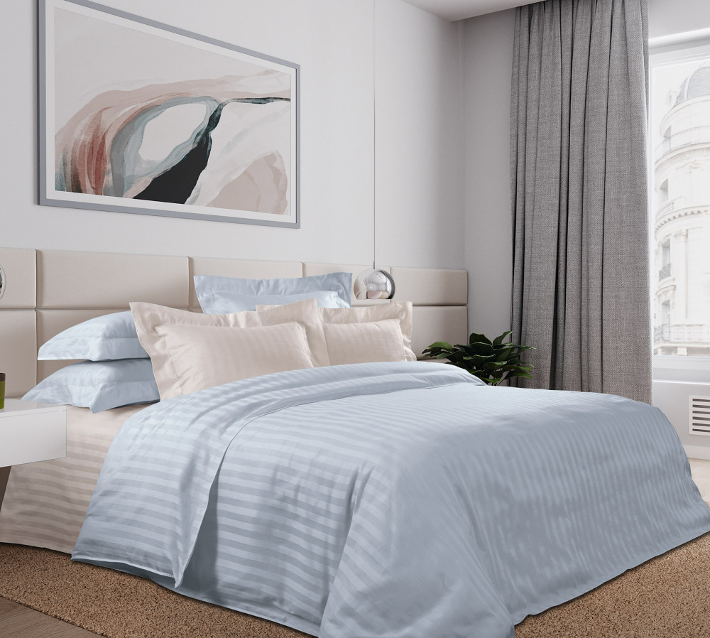 Комплект постельного белья страйп-сатин из длинноволокнистого хлопка высокой плотности 200ТС. Сатиновое плетение придает ткани мягкость, шелковистость, эластичность и благородный блеск. Высококачественная натуральная ткань из 100% мерсеризованного хлопка отлично пропускает воздух и впитывает влагу, не вызывает аллергии и раздражения кожи, не накапливает статического электричества, хорошо драпируется и почти не мнется, можно гладить по настроению.