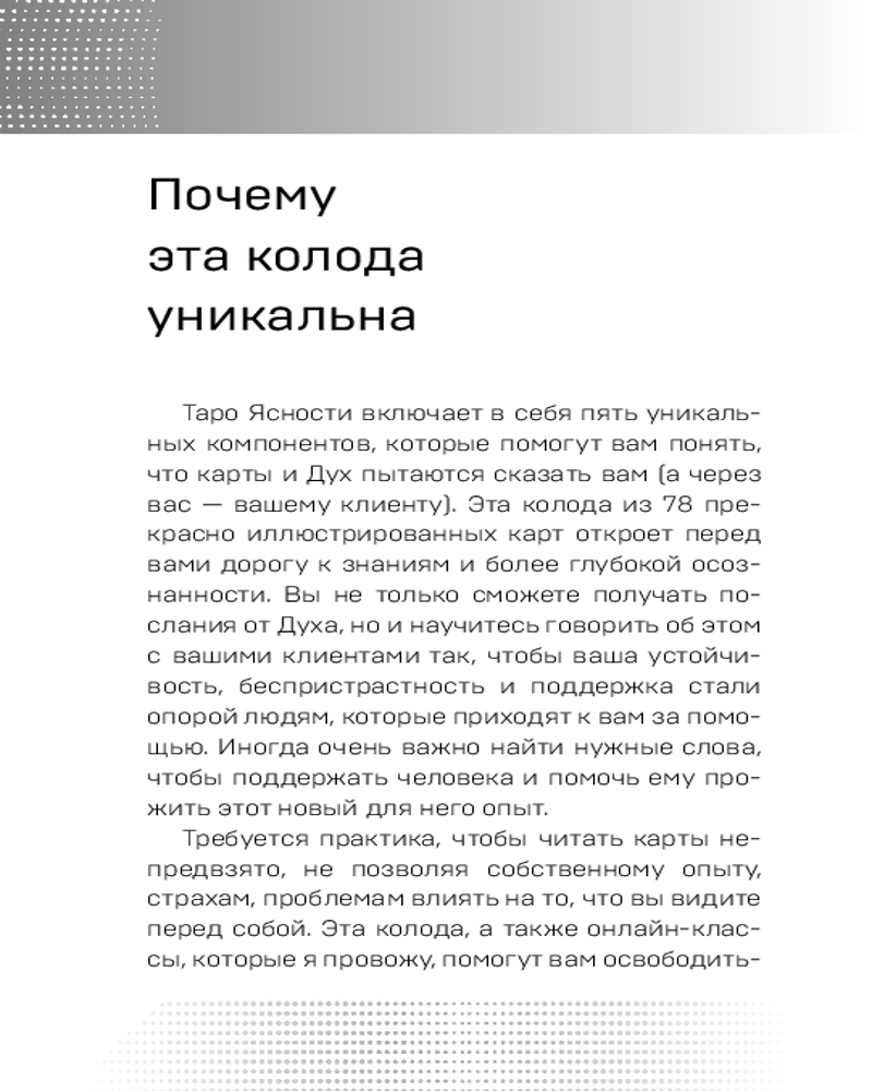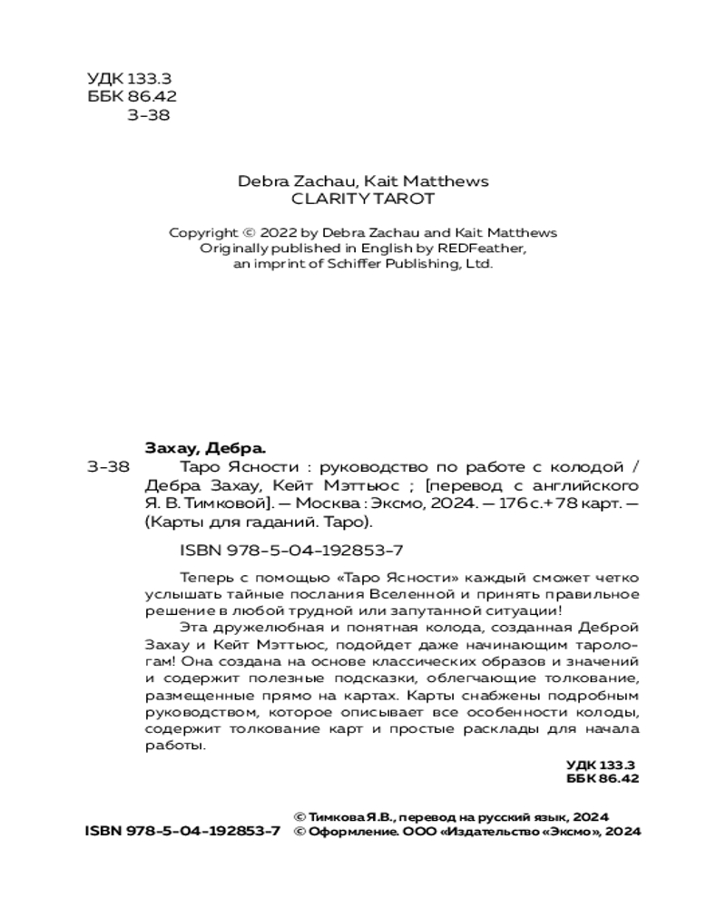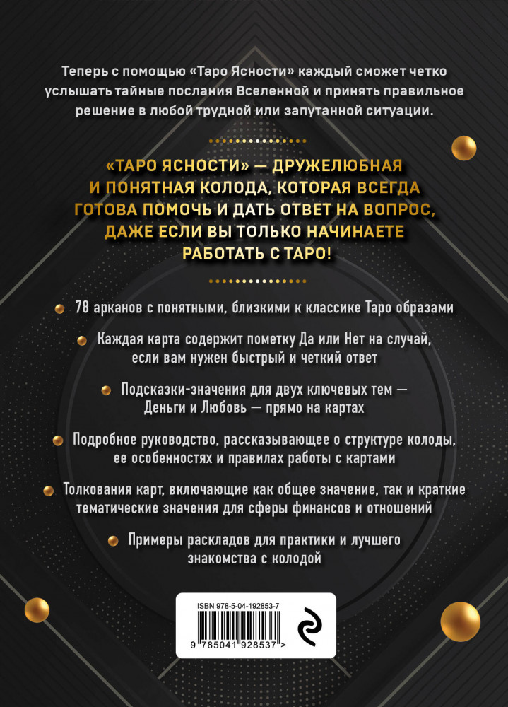 💳 Оплатить за товар можно при получении 🇰🇿 Есть бесплатная доставка по Казахстану от 1 дня 🎁 Копите бонусы с каждой покупки Серия: Карты для гаданий. Таро «Таро Ясности» — дружелюбная и понятная колода, созданная Деброй Захау и Кейт Мэттьюс, всегда готова помочь вам прояснить ситуацию и принять верное решение. Она подойдет даже начинающим тарологам, так как создана на основе классических образов и значений и содержит полезные подсказки, размещенные прямо на картах. |