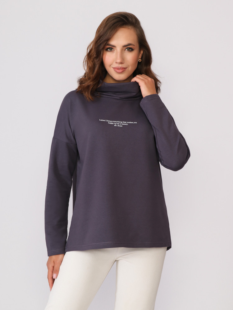 Комфортный джемпер – это сочетание элегантности и удобства. Модель выполнена из теплого футера, натурального хлопкового материала. Крой свободный, скрывает любые недостатки фигуры. Воротник-хомут подчеркивает шею и овал лица. Рукава длинные, не прикрывают запястья. Край полукруглый, удлиненный сзади. На груди стильная принтовая надпись. Подходит для взрослых женщин и юных девушек. Сочетается с брюками, лосинами и шортами.
