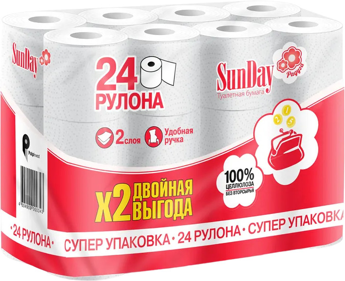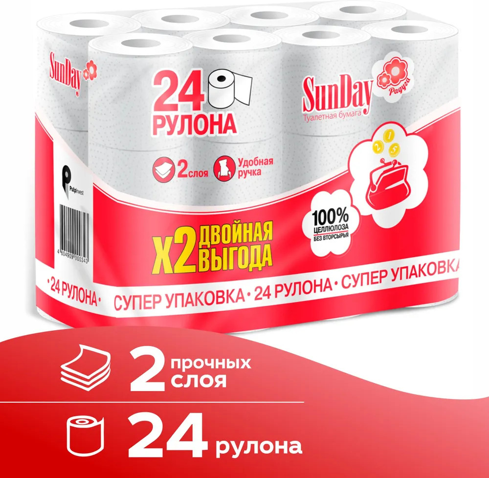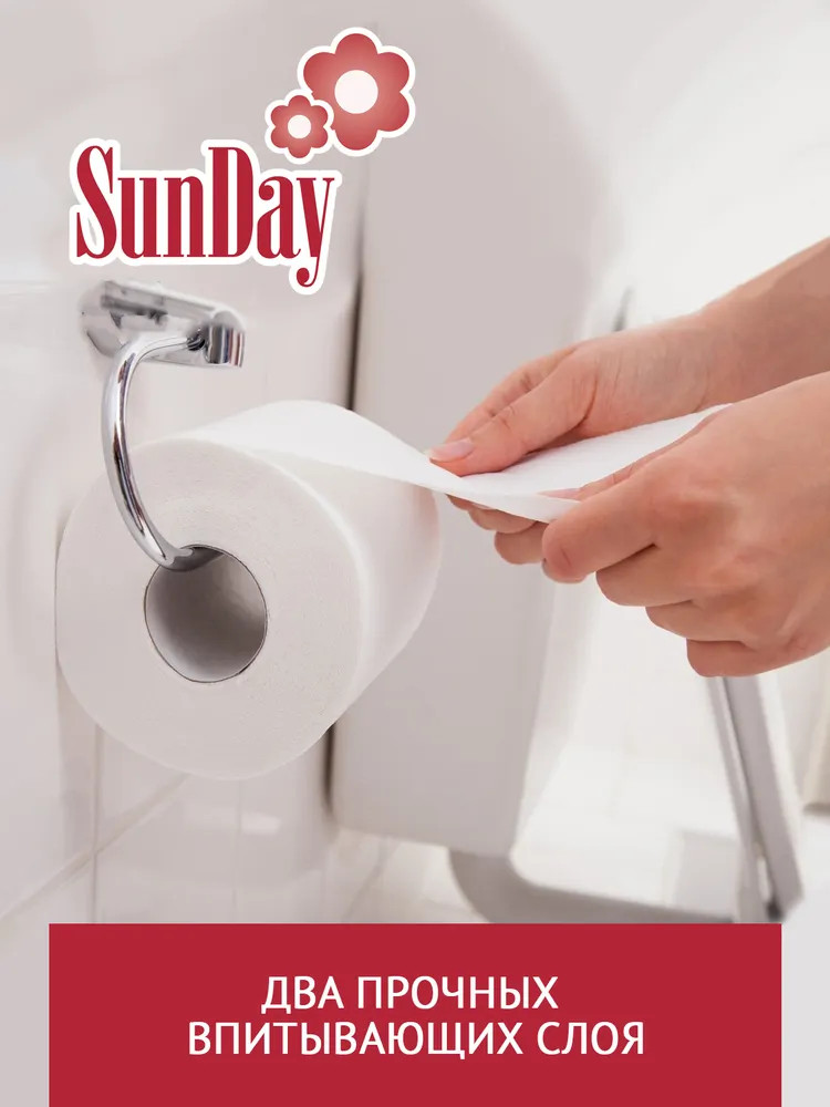 Туалетная бумага «SunDay» 2 слоя – бюджетное, но практичное санитарно-гигиеническое средство, которое может использоваться и для ухода за домом. Изделие снежно-белого цвета обладает мягкой и шелковистой поверхностью, оно не вызывает аллергии, так как не содержит в своем составе ни ароматизаторов, ни других сомнительных компонентов.