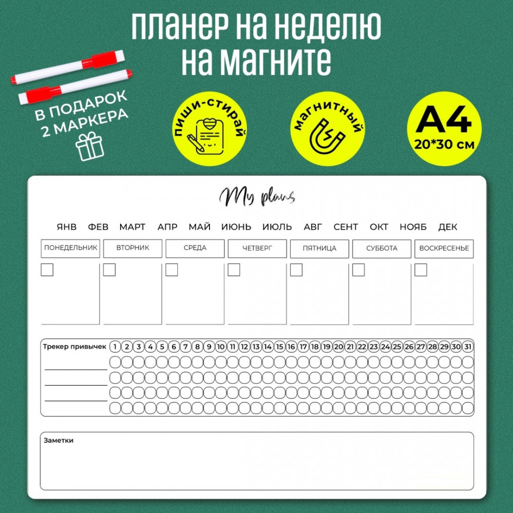 Magnetica Магнитный планер на неделюВ данный момент этот товар отсутствует в продаже. Возможно, у нас найдется аналогичный или похожий товар здесь. Магнитный планер прочно крепится к холодильнику или любой другой металлической поверхности. Поверхность многоразовая пиши-стирай. |
