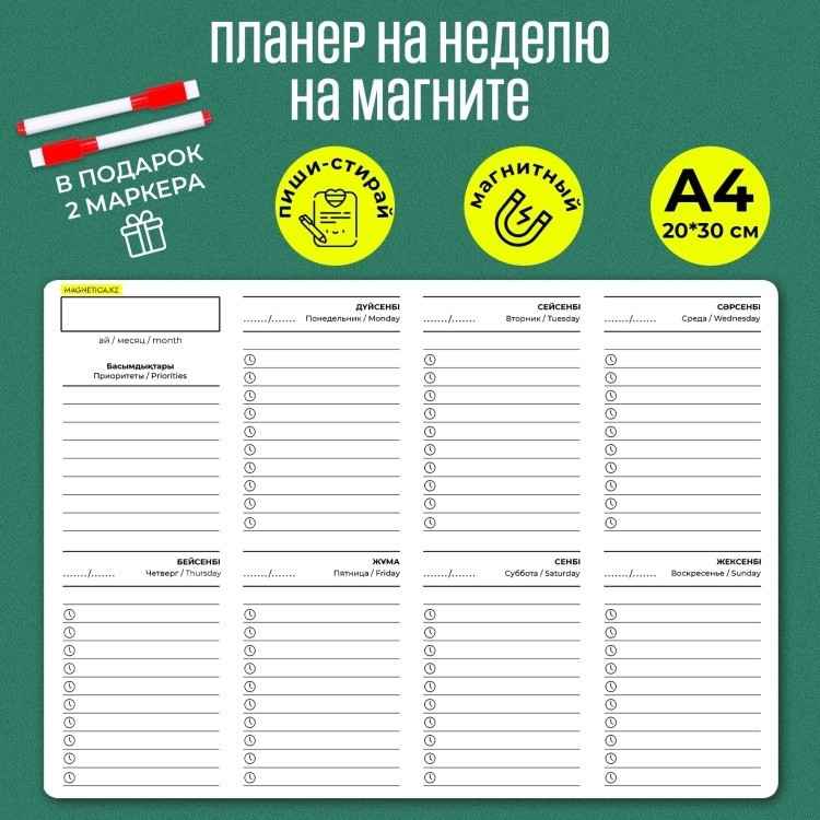 Magnetica Планер магнитныйВ данный момент этот товар отсутствует в продаже. Возможно, у нас найдется аналогичный или похожий товар здесь. Еженедельный планер на магните на холодильник. Дизайн выполнен в стиле ежедневника. Названия граф на трех языках: казахском, русском, английском. Все записи легко стираются губкой или влажной салфеткой. Планер используется многоразово длительное время. В комплекте 2 маркера с губкой и магнитиком. |