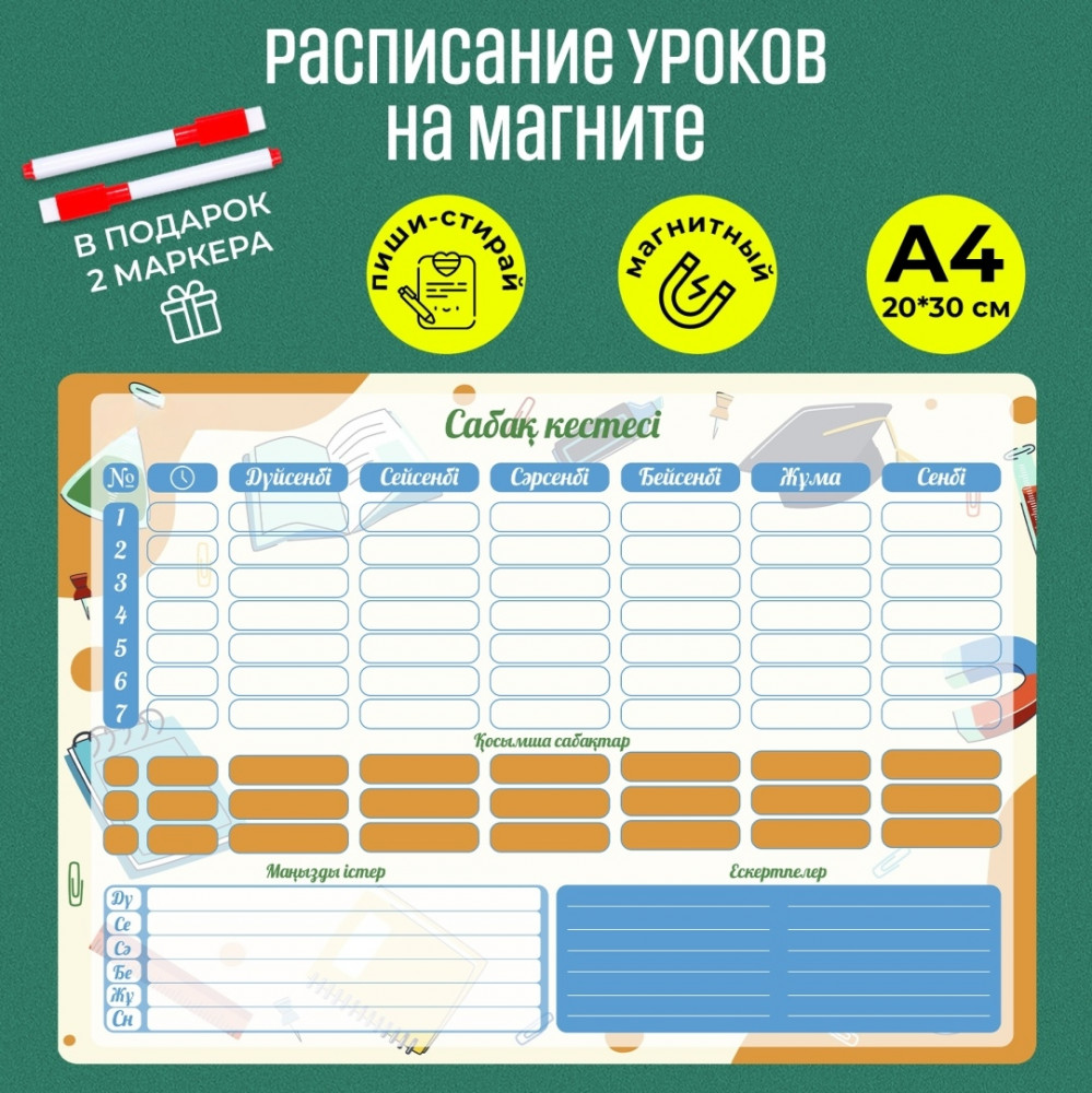 Magnetica Магнитный планер «Расписание уроков»В данный момент этот товар отсутствует в продаже. Возможно, у нас найдется аналогичный или похожий товар здесь. Используйте планер как расписание уроков или расписание дня. Подойдёт для учеников любых классов, студентов. Полностью на магните — надежно крепится на холодильнике. Все записи легко стираются губкой или влажной салфеткой. Используйте планер длительное время. |