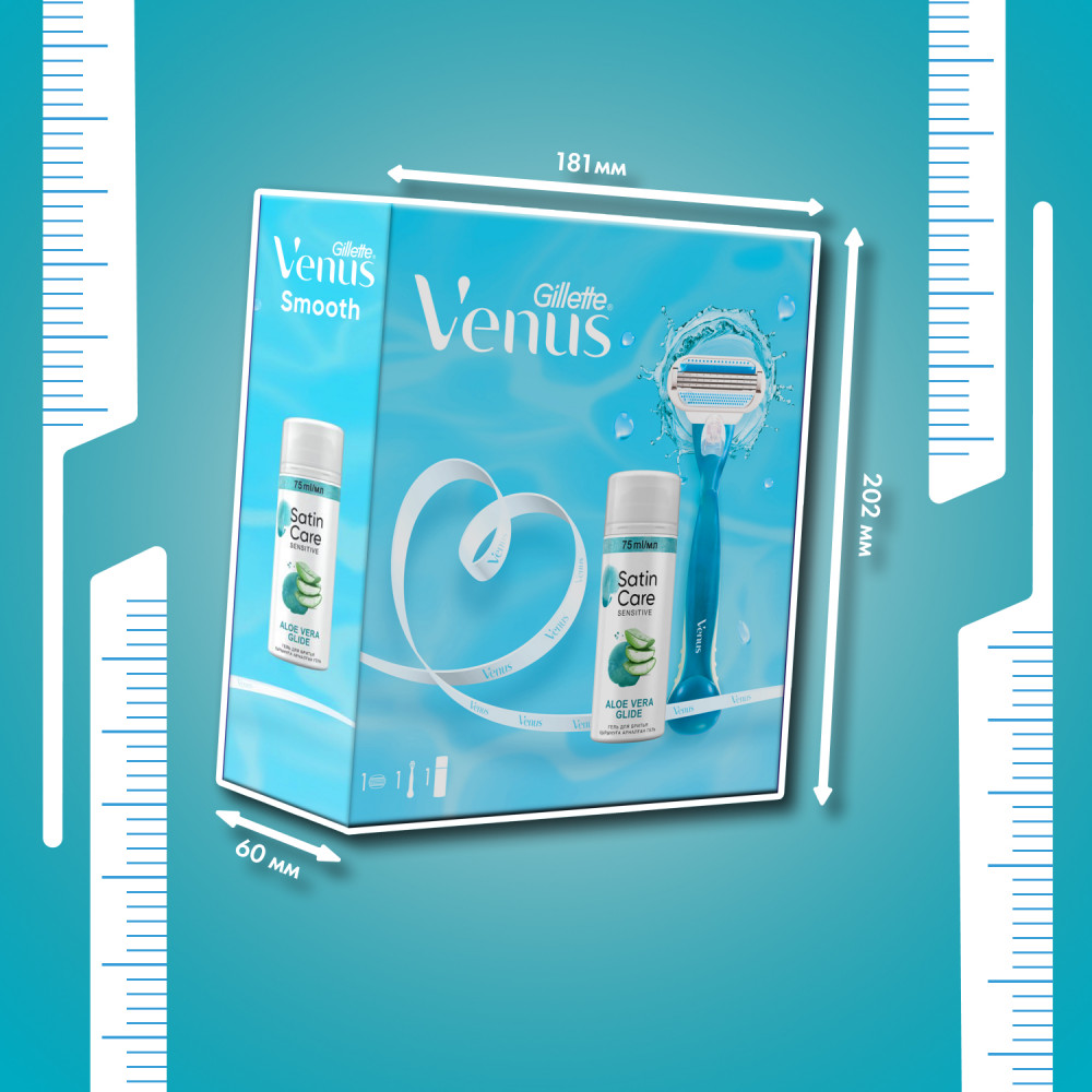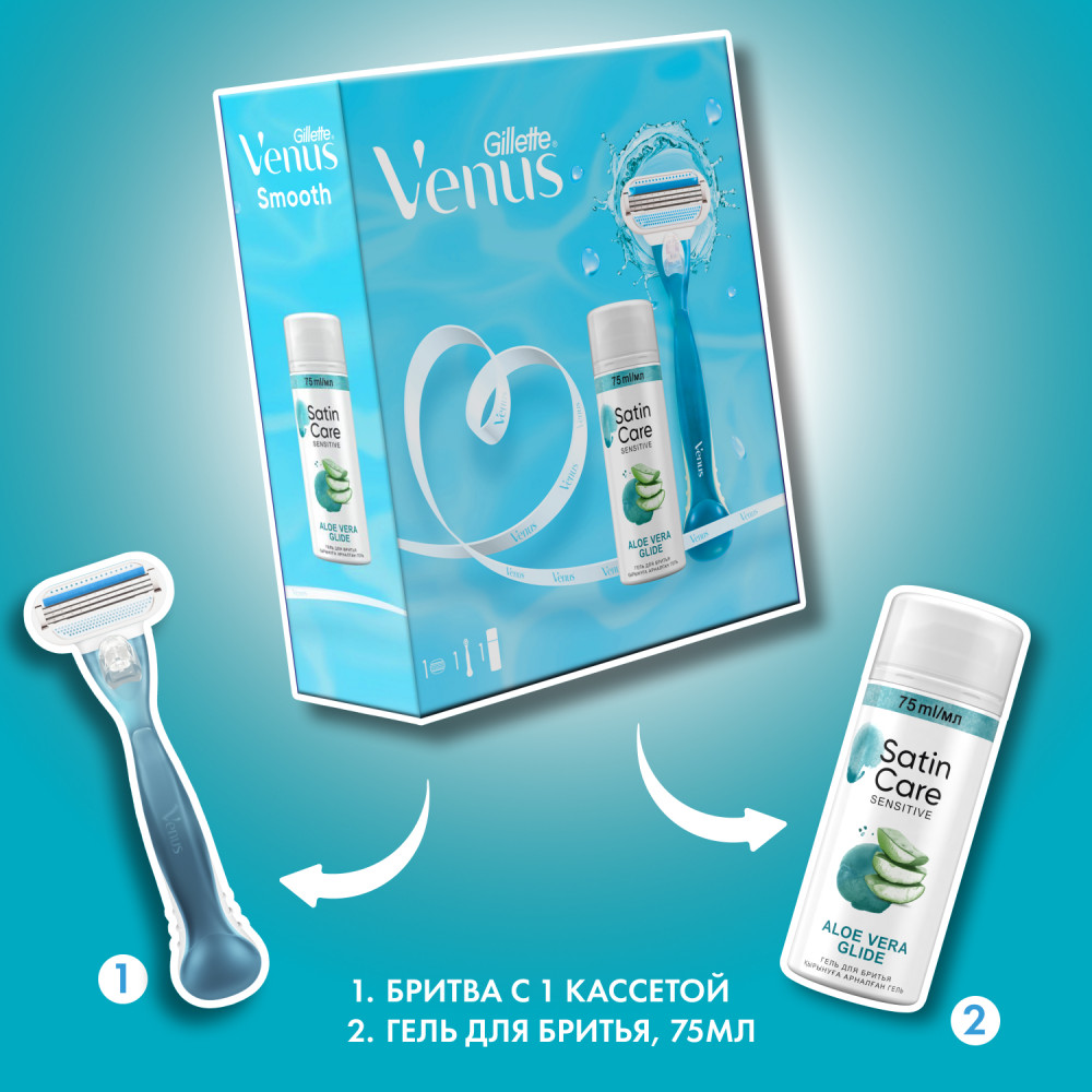 Набор для женщин с бритвой Gillette Venus Smooth и гелем для бритья Satin care. |
