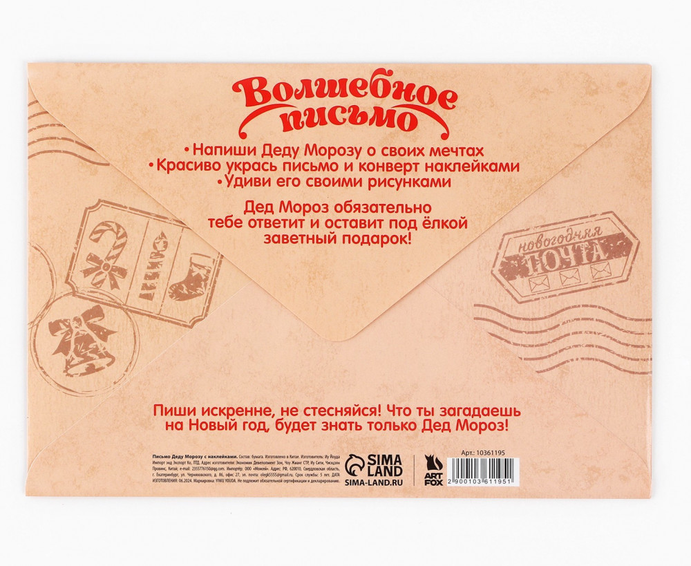 ArtFox Письмо Деду Морозу с наклейками «Новый год: Новогодняя почта. Волшебное письмо»В данный момент этот товар отсутствует в продаже. Возможно, у нас найдется аналогичный или похожий товар здесь. Серия: Символ года 2025 Как Дед Мороз узнает о том, какой подарок вы мечтаете получить? Конечно, с помощью новогоднего письма! Его яркий оригинальный дизайн привлечёт внимание получателя и он, непременно, исполнит ваше желание в первую очередь! |