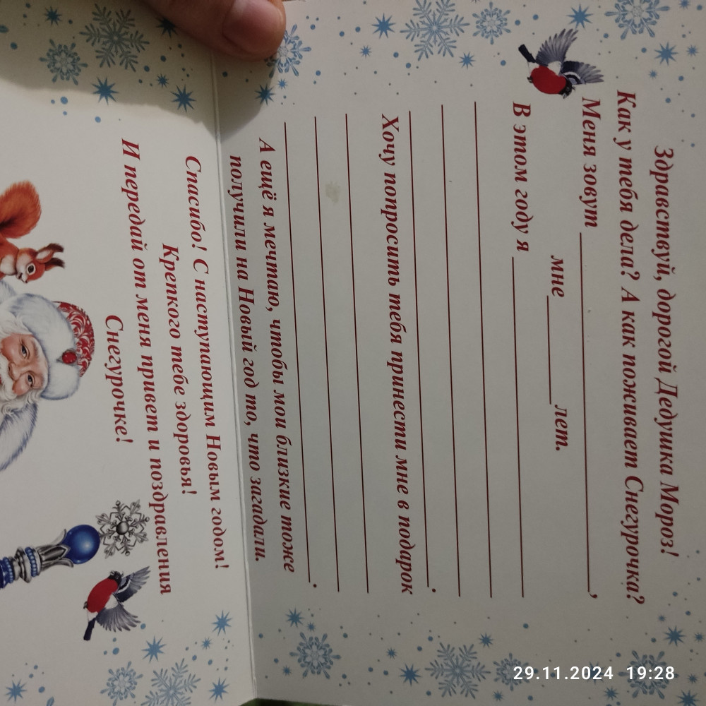 Мир открыток Письмо Деду МорозуВ данный момент этот товар отсутствует в продаже. Возможно, у нас найдется аналогичный или похожий товар здесь. Серия: Новый год Как Дед Мороз узнает о том, какой подарок вы мечтаете получить? Конечно, с помощью новогоднего письма! Его яркий оригинальный дизайн привлечёт внимание получателя, и он непременно исполнит ваше желание в первую очередь! Настоящий ответ от Деда Мороза можно получить только в случае, если послание будет отправлено по всем требованиям волшебной почты. Письмо нужно отправлять заранее (в начале декабря), ведь у дедушки и его преданных помощников так много работы, что они могут просто не успеть ответить всем ребятишкам вовремя. |