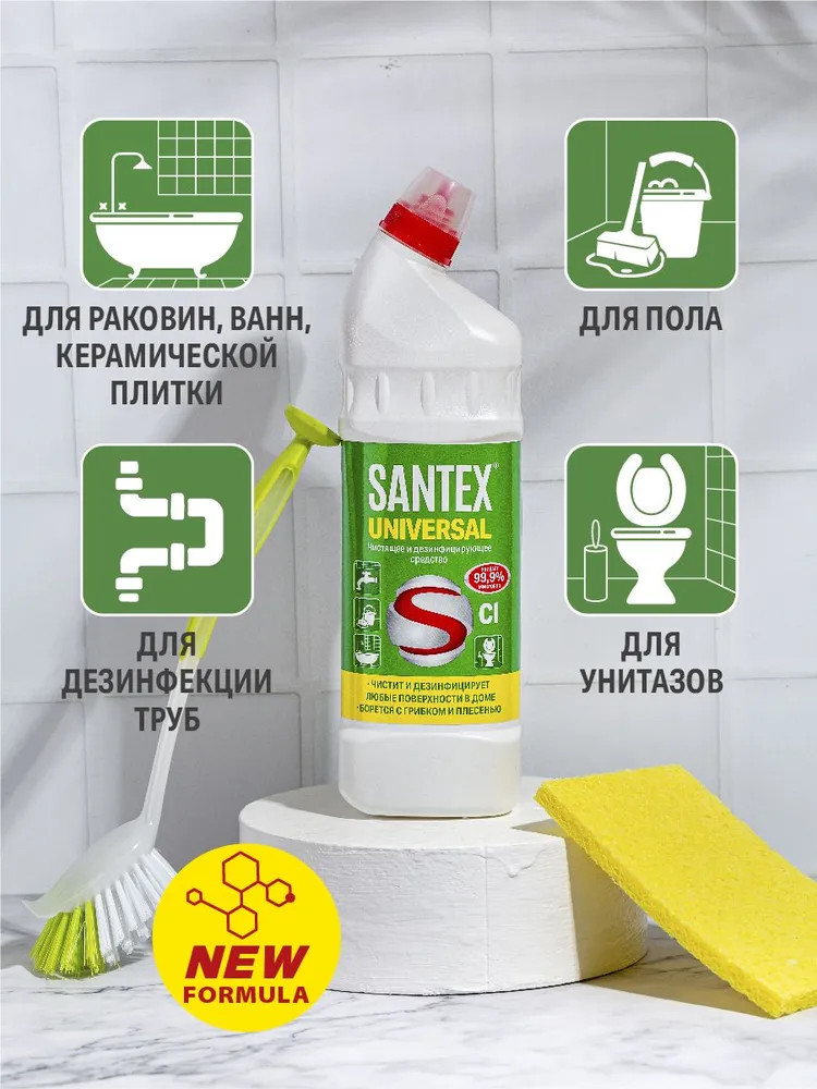 Моющее средство для унитаза и ванной эффективно защищает сантехнику от известкового налета, ржавчины. Гель с хлором отлично борется с грибком и плесенью. Очиститель применяется для дезинфекции рабочих поверхностей на кухне и чистки раковин. В разбавленном виде используется как жидкость для мытья полов и натяжного потолка.