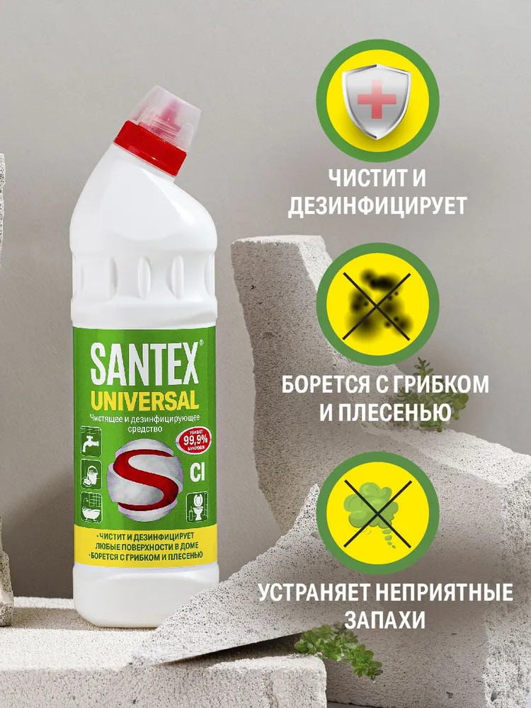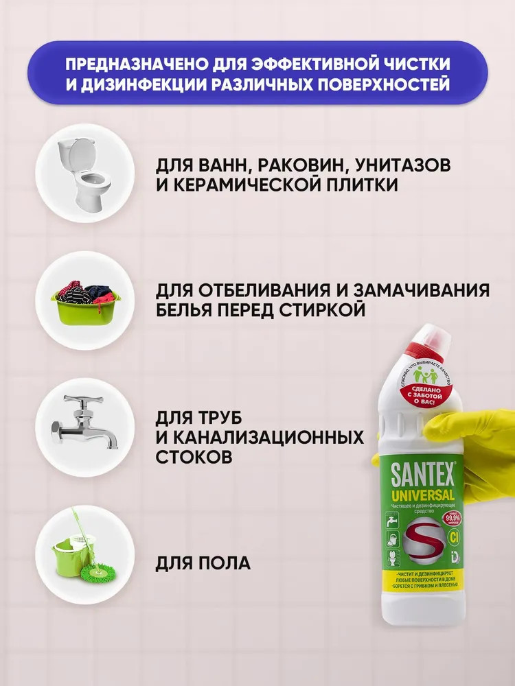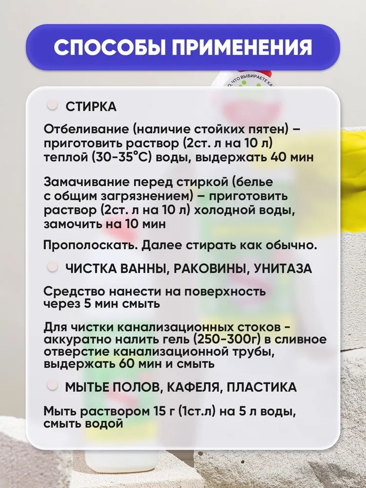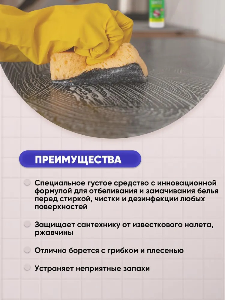 Специальное густое средство с инновационной формулой для отбеливания и замачивания белья перед стиркой, чистки и дезинфекции ванн, раковин и унитазов, канализационных стоков, полов, кафеля, неметаллической посуды. Чистящий гель с хлором — универсальный помощник для повседневной уборки дома, который обеспечит безупречную чистоту и ослепительный блеск.