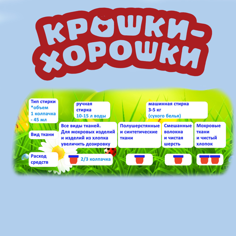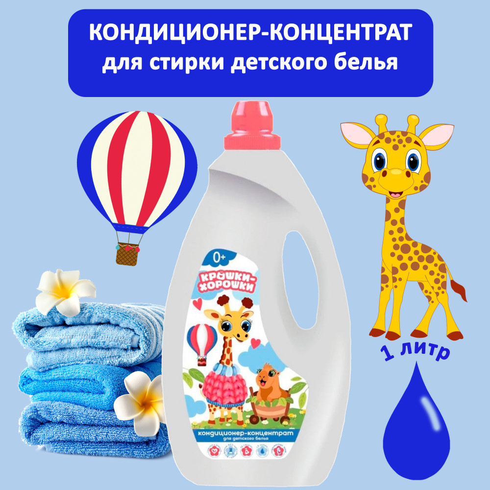 Концентрированный кондиционер для детского белья «Крошки-Хорошки» — 1 литр = 33 стирки. Предназначен для автоматического и ручного полоскания всех видов тканей (хлопчатобумажных, льняных, синтетических, деликатных, шерсти, шелка). Каждая Крошка с рождения нуждается в своей фее-Хорошке, которая будет заботиться и помогать маленькому шалуну свершать свои первые подвиги. Ну а кто же будет поддерживать Вас, наших Хорошек? Для Вас мы создали «Содружество мам», объединяющее мам-специалистов в области по уходу за малышами. В течение 5 лет мы шаг за шагом отбирали лучшие и безопасные ингредиенты для наших средств. Каждая рецептура прошла личную проверку, прежде чем попасть к вам в руки. Весь наш лучший опыт и материнская забота собраны в детской серии "Крошки — Хорошки".