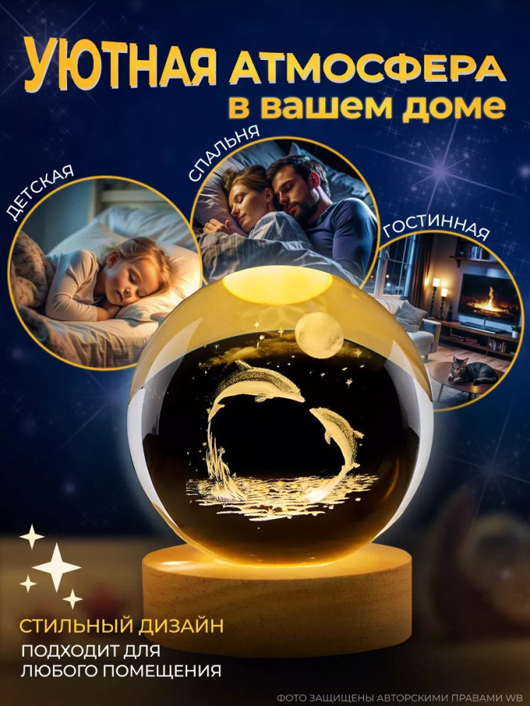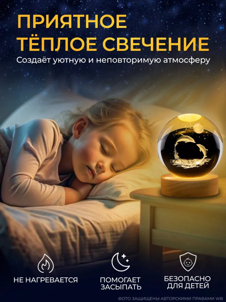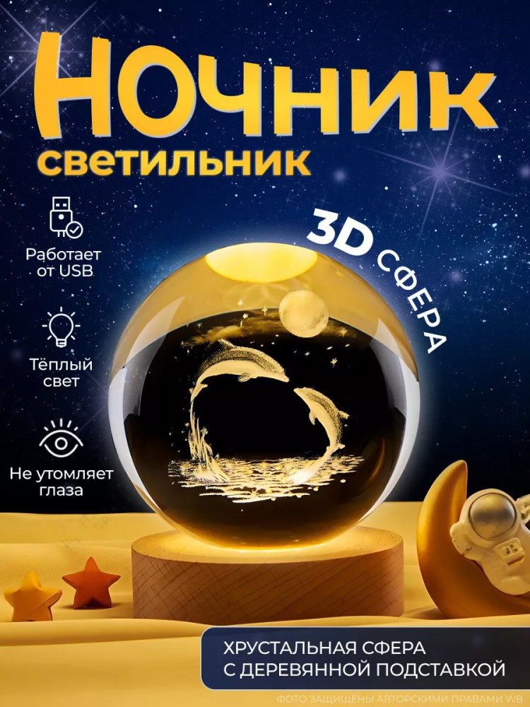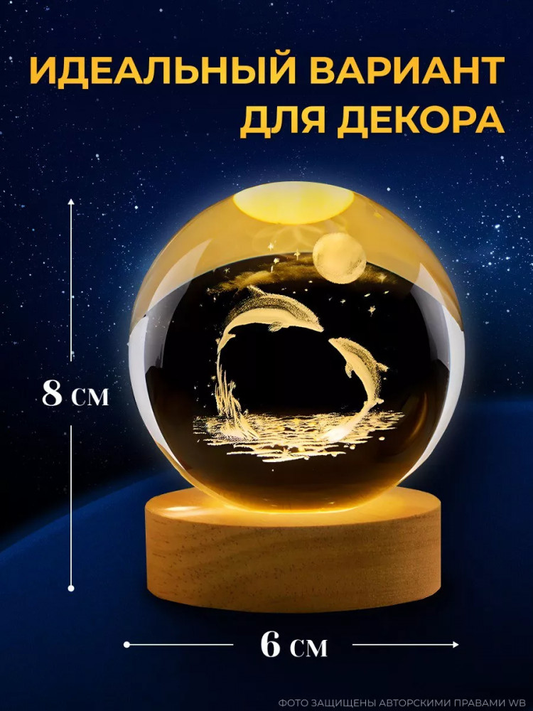 Ночник с 3d-эффектом идеально подойдет для оформления спальни, гостиной, детской комнаты или в качестве прикроватного ночника. Ночник хрустальный светящийся шар — отличная альтернатива таким ночникам как звездное небо, ночник с маркером. Этот светильник подойдет для девочек, мальчиков или новорожденных, а так же будет памятным подарком для близких людей. Идеальный вариант подарка под елку! Светодиодный ночник имеет комфортный мягкий теплый свет. Подходит для использования днем и ночью. Диаметр деревянной подставки 6 см, диаметр шара 6 см, высота 7.5 см (с подставкой).
