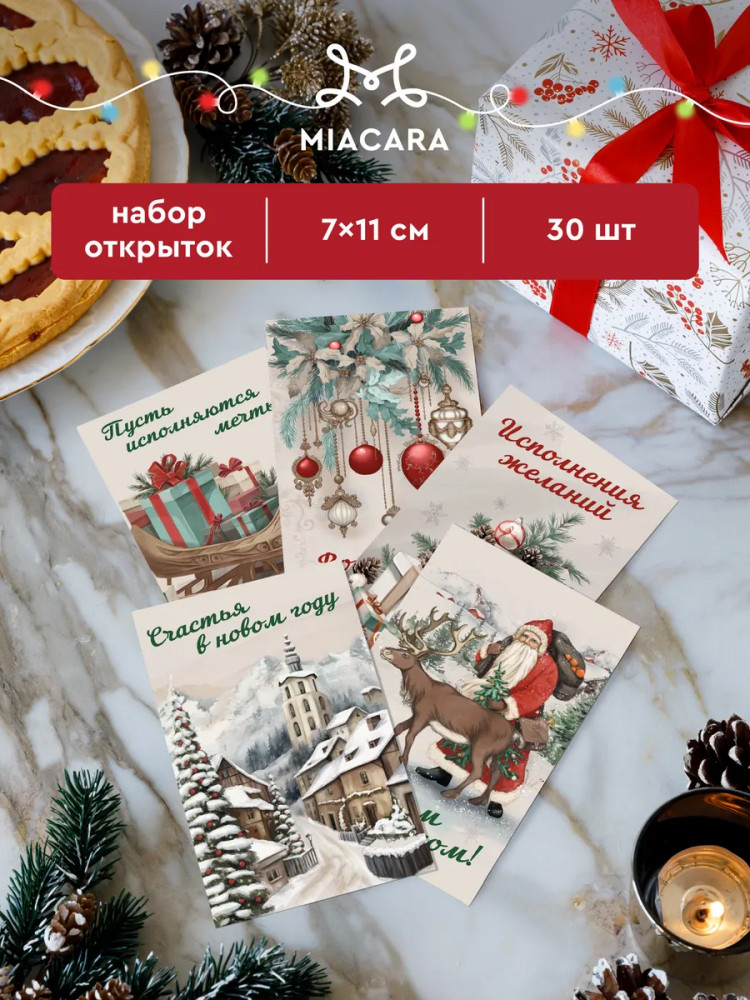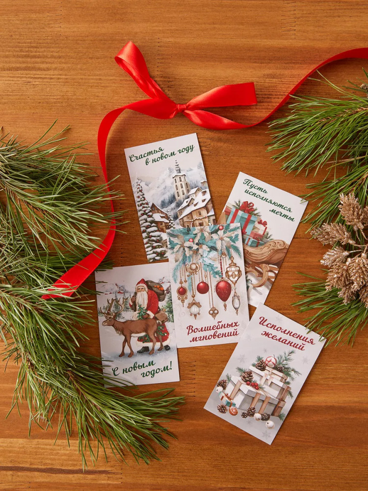 Набор новогодних мини-открыток. Коллекция состоит из 30 открыток, сделанных из плотного картона плотностью 250 г/м2. С одной стороны открыточки — изображение, а с другой можно написать поздравление ребенку или взрослому. Прямоугольные открытки размером 7×11 см удобно прикрепить к коробке или положить в поздравительный конверт. Они идеально подойдут для оформления подарков взрослым или детям. В коллекции идут 30 открыток: 6 штук на каждый из 5 дизайнов. На серо-бежевых открытках изображены праздничные картинки. А еще на открытках есть надписи — праздничные пожелания с Новым годом.