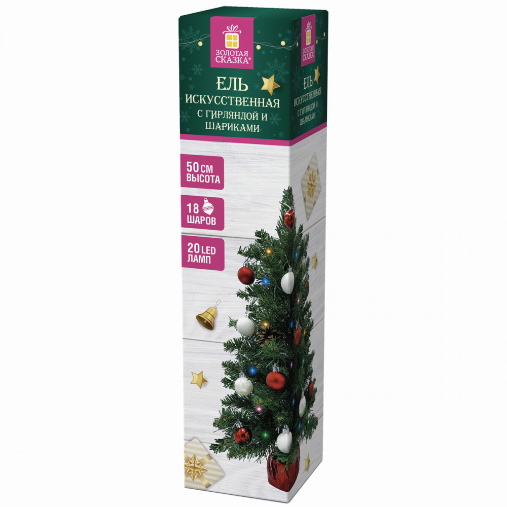 Ель искусственная декоративная Золотая сказка станет прекрасным украшением для дома или офиса, преобразит пространство, а также подарит праздник и новогоднее настроение. Ель искусственная декоративная представляет собой конструкцию из металлического каркаса и закрепленных на нем «ветвей», выполненных из стальной проволоки и декорированных искусственной хвоей из полимерных материалов. Материал хвои — ПВХ. Высота ели — 50 см, диаметр нижнего яруса — 26 см. Все элементы набора упакованы в цветную картонную коробку. |