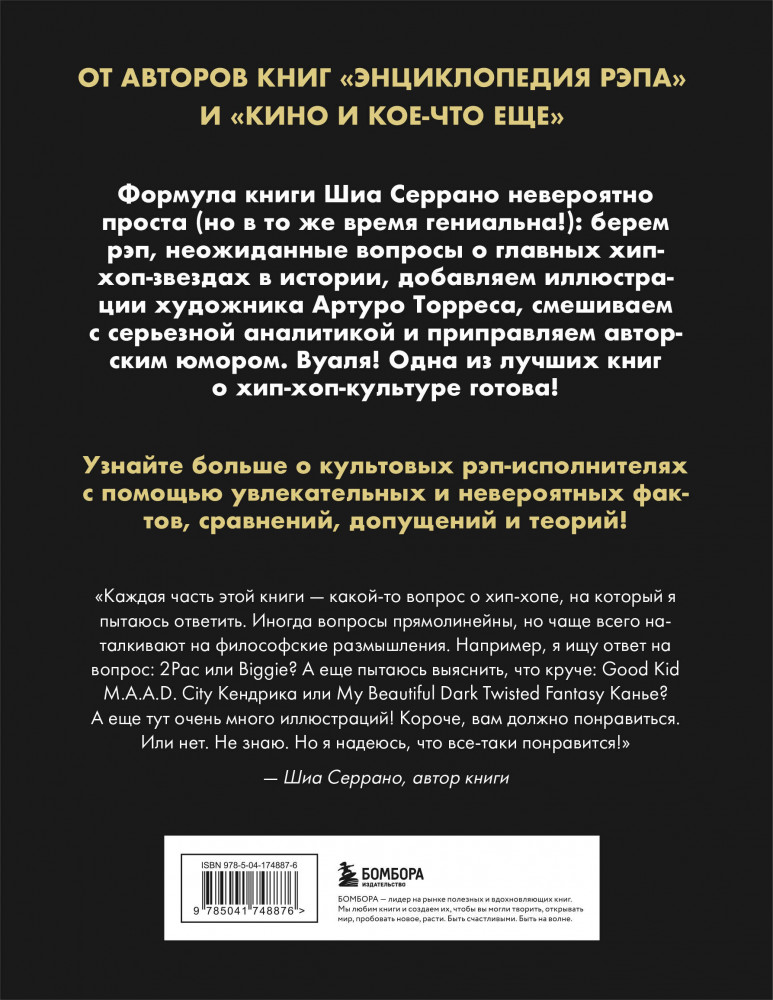 💳 Оплатить за товар можно при получении 🇰🇿 Есть бесплатная доставка по Казахстану от 1 дня 🎁 Копите бонусы с каждой покупки Серия: Районы и стадионы: главные книги о хип-хопе и рэп-музыке Впервые на русском! Книга от автора бестселлеров «Энциклопедия рэпа» и «Кино и кое-что еще». Шиа Серрано объединил всё лучшее, что было в его предыдущих книгах. Формула проста: берем рэп, неожиданные вопросы о главных хип-хоп звездах в истории, добавляем иллюстрации художника Артуро Торреса, смешиваем с серьезной аналитикой и приправляем авторским юмором. Вуаля! Одна из лучших книг о культуре хип-хопа готова. |