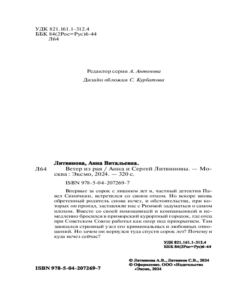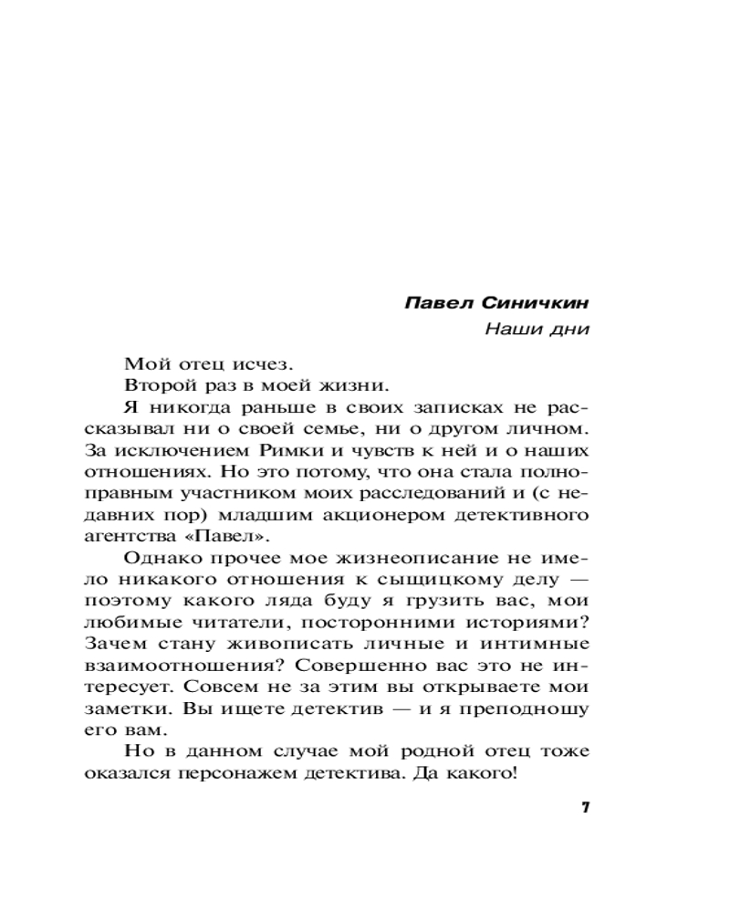 Серия: Знаменитый тандем российского детектива. Новые страницы Впервые за сорок с лишним лет я, частный детектив Павел Синичкин, встретился со своим отцом. Но вскоре вновь обретенный родитель снова исчез, и обстоятельства, при которых он пропал, заставляли нас с Риммой задуматься о самом плохом. Вместе со своей помощницей и компаньонкой я немедленно бросился в приморский курортный городок, где отец при Советском Союзе работал как опер под прикрытием. Там завязался странный узел его криминальных и любовных отношений. Но зачем он вернулся туда спустя сорок лет? Почему и куда исчез сейчас? |