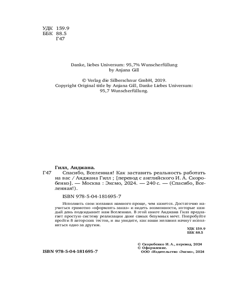 💳 Оплатить за товар можно при получении 🇰🇿 Есть бесплатная доставка по Казахстану от 1 дня 🎁 Копите бонусы с каждой покупки Серия: Спасибо, Вселенная! Дневники благодарностей, сжигание бумажек с желанием, списки «хотелок», повторение мантр и попытка жить «в потоке в моменте» — не приблизят вас к мечте, пока вы не отладите «систему коммуникаций» со Вселенной! Так считает автор этой книги Анджана Гилл, которая, перепробовав десятки способов загадывания желаний, вывела свою формулу реализации даже самых безумных затей и апробировала ее на тысячах своих слушателей. |