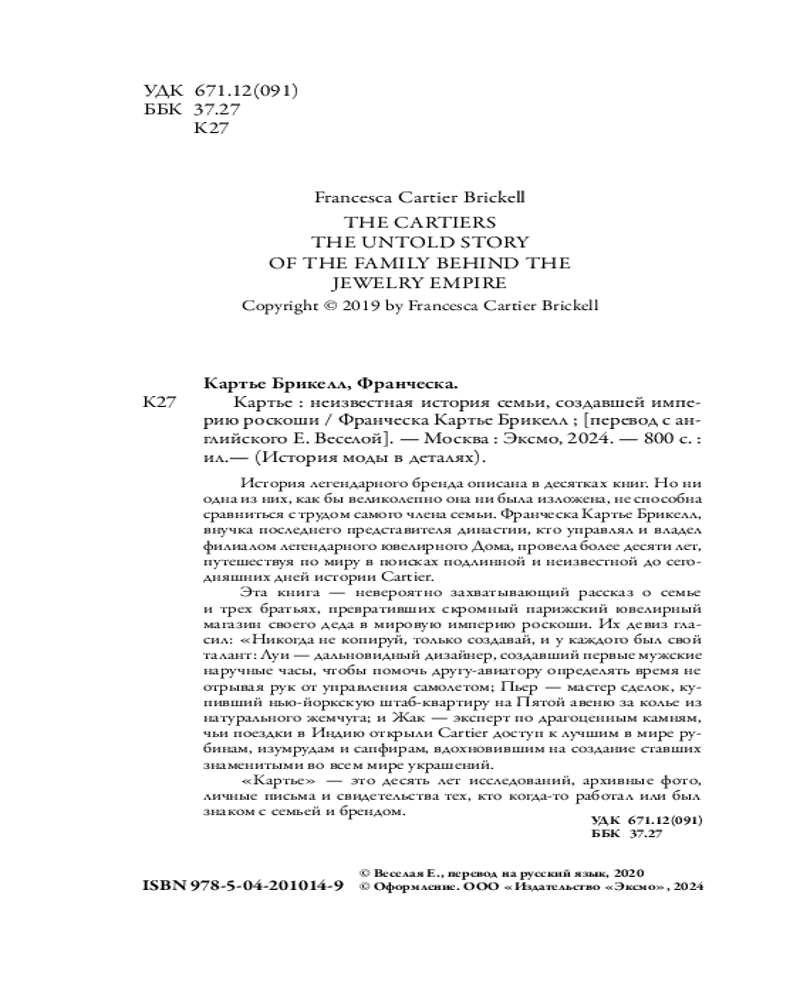 💳 Оплатить за товар можно при получении 🇰🇿 Есть бесплатная доставка по Казахстану от 1 дня 🎁 Копите бонусы с каждой покупки Серия: История моды в деталях Франческа Картье Брикелл — прямой потомок Картье. Ее прапрапрадед основал компанию Cartier в 1847 году, а покойный дед, Жан-Жак Картье, был последним представителем семьи, который управлял и владел филиалом легендарного ювелирного Дома. Оставив карьеру в сфере финансов, Франческа посвятила 10 лет жизни независимому исследованию истории династии. |