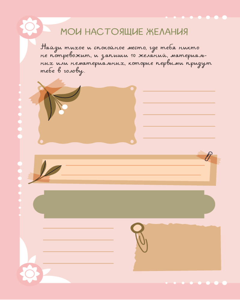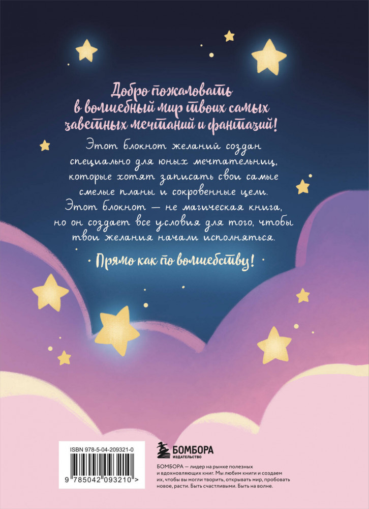 💳 Оплатить за товар можно при получении 🇰🇿 Есть бесплатная доставка по Казахстану от 1 дня 🎁 Копите бонусы с каждой покупки Серия: Дневнички и анкеты для девочек. Собери свои секреты, мысли и эмоции Добро пожаловать в волшебный мир самых заветных мечтаний и фантазий! Каждой девочки! Этот блокнот желаний создан специально для юных мечтательниц, которые хотят записать свои самые смелые планы и сокровенные цели. Здесь девочка найдет множество ярких страниц, на которых можно формулировать свои желания, ставить себе цели, делать зарисовки, а также делиться своими мыслями и переживаниями. Направляющие вопросы и задания помогут каждой девочке лучше узнать себя, понять, чего она на самом деле хочет и как этого достичь. Этот блокнот — не магическая книга, но он создает все условия для того, чтобы желания начали исполняться. Прямо как по волшебству! |