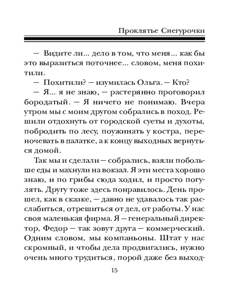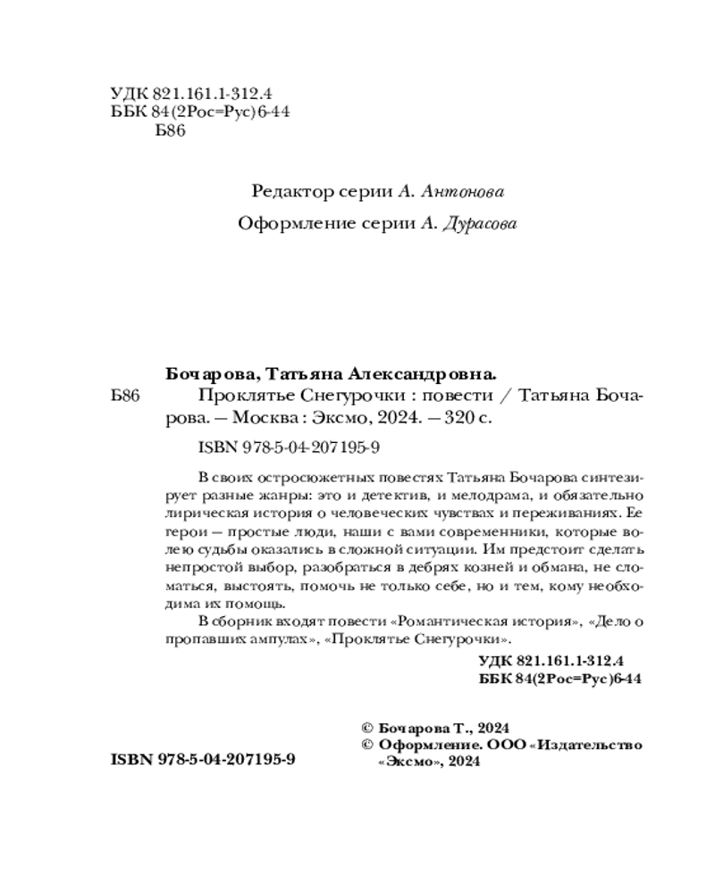 💳 Оплатить за товар можно при получении 🇰🇿 Есть бесплатная доставка по Казахстану от 1 дня 🎁 Копите бонусы с каждой покупки Серия: Детектив сильных страстей. Романы Т. Бочаровой. Новое оформление (обложка) В своих остросюжетных повестях Татьяна Бочарова синтезирует разные жанры: это и детектив, и мелодрама, и обязательно лирическая история о человеческих чувствах и переживаниях. Ее герои — простые люди, наши с вами современники, которые волею судьбы оказались в сложной ситуации. Им предстоит сделать непростой выбор, разобраться в дебрях козней и обмана, не сломаться, выстоять, помочь не только себе, но и тем, кому необходима их помощь. В сборник входят повести «Романтическая история», «Дело о пропавших ампулах», «Проклятье Снегурочки». |