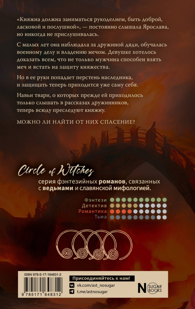 💳 Оплатить за товар можно при получении 🇰🇿 Есть бесплатная доставка по Казахстану от 1 дня 🎁 Копите бонусы с каждой покупки Серия: NoSugar. Ведьмин круг «Княжна должна заниматься рукоделием, быть доброй, ласковой и послушной», — постоянно слышала Ярослава, но никогда не прислушивалась. С малых лет она наблюдала за дружиной дяди, обучалась военному делу и владению мечом. Девушке хотелось доказать всем, что не только мужчина способен взять меч и встать на защиту княжества. Но в ее руки попадает перстень наследника, и защищать теперь приходится уже саму себя. Навьи твари, о которых прежде ей приходилось только слышать в рассказах дружинников, теперь всюду преследуют княжну. Можно ли найти от них спасение? |