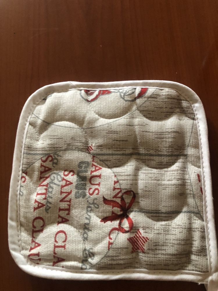 прекрасная новогодняя прихватка и размер хороший и цена. тканевая.