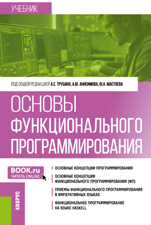 Рассматриваются основы функционального программирования, главной целью которого является создание программ. Помимо теоретического материала содержатся примеры, диаграммы и иллюстрации, описывающие идеи функционального программирования, включая ленивые вычисления, объекты-функции и вызываемые объекты, алгебраические типы данных и т.п. Соответствует ФГОС ВО последнего поколения. Для студентов бакалавриата, обучающихся по направлениям «Прикладная информатика», «Информационные системы и технологии», «Прикладная математика и информатика», «Бизнес-информатика», «Информатика и вычислительная техника», а также преподавателей, слушателей системы повышения квалификации и всех интересующихся вопросами функционального программирования. |