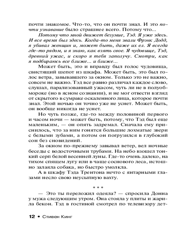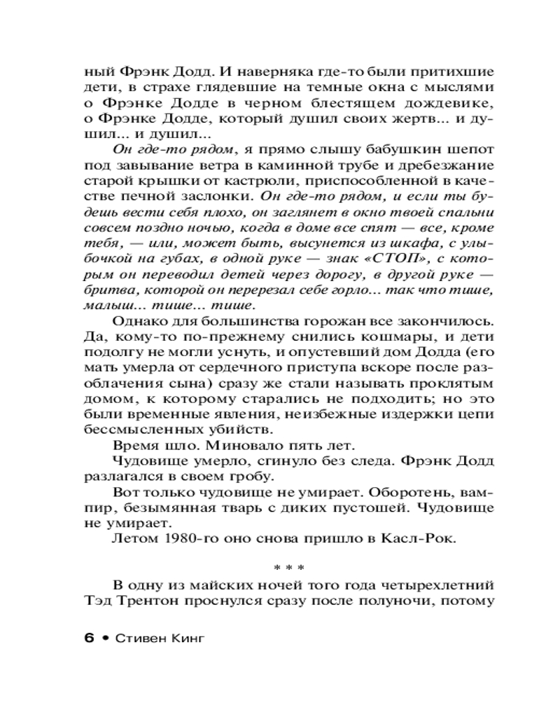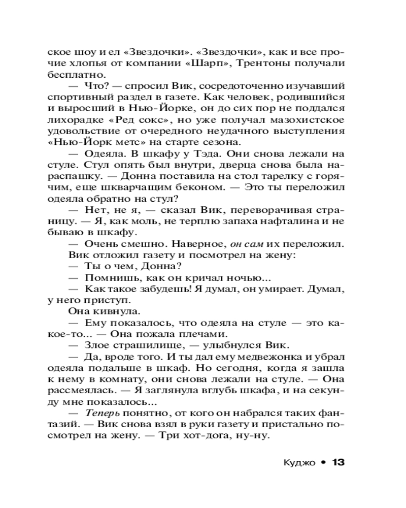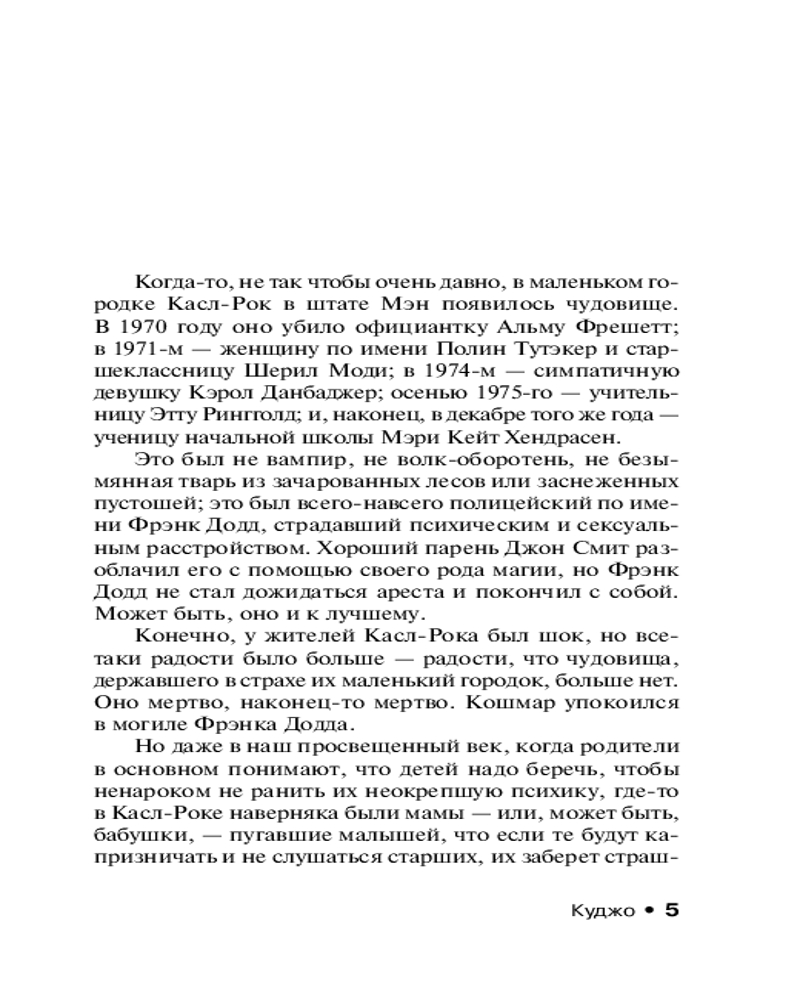 💳 Оплатить за товар можно при получении 🇰🇿 Есть бесплатная доставка по Казахстану 🎁 Копите бонусы с каждой покупки Серия: Эксклюзивная классика Один из обитателей тихого провинциального городка Касл-Рок — добродушный сенбернар Куджо. Однажды, преследуя кролика, он загоняет его в маленькую пещеру, где получает укус летучей мыши. На первый взгляд безобидное происшествие оборачивается настоящей трагедией. И возвращается Куджо к хозяевам уже совсем другим — чудовищем, сеющим смерть. Счет его жертв постоянно увеличивается. Справиться с ним кажется невозможным. И невольно возникает мысль: какая в действительности болезнь может превратить животное в настоящего монстра? И можно ли это зло искоренить раз и навсегда?.. |
