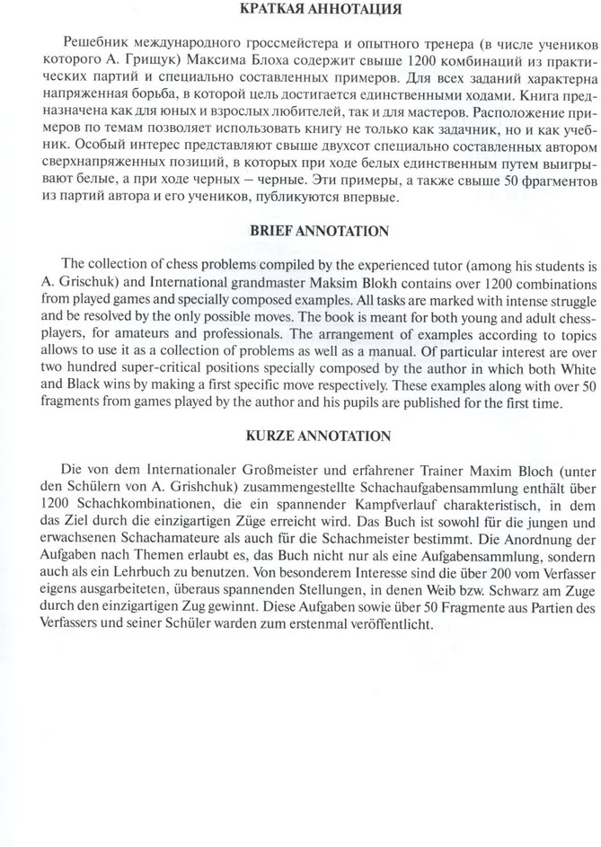 💳 Оплатить за товар можно при получении 🇰🇿 Есть бесплатная доставка по Казахстану от 1 дня 🎁 Копите бонусы с каждой покупки Серия: Секреты шахмат Решебник международного гроссмейстера и опытного тренера (в числе учеников которого А. Грищук) Максима Блоха содержит свыше 1200 комбинаций из практических партий и специально составленных примеров. Для всех заданий характерна напряженная борьба, в которой цель достигается единственными ходами. Книга предназначена как для юных и взрослых любителей, так и для мастеров. Расположение примеров по темам позволяет использовать книгу не только как задачник, но и как учебник. Особый интерес представляют свыше двухсот специально составленных автором сверхнапряженных позиций, в которых при ходе белых единственным путем выигрывают белые, а при ходе черных — черные. Эти примеры, а также свыше 50 фрагментов из партий автора и его учеников, публикуются впервые. |