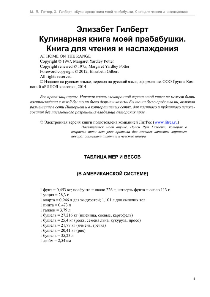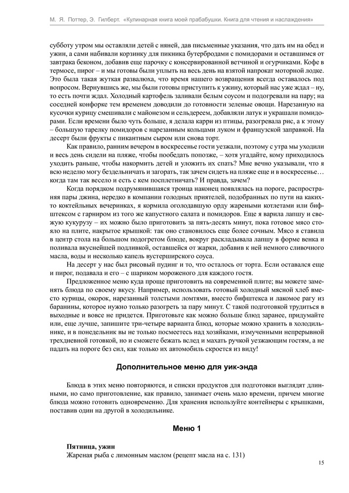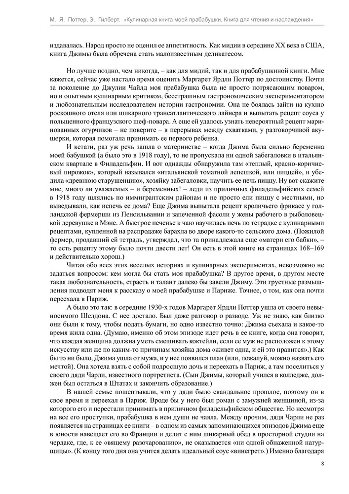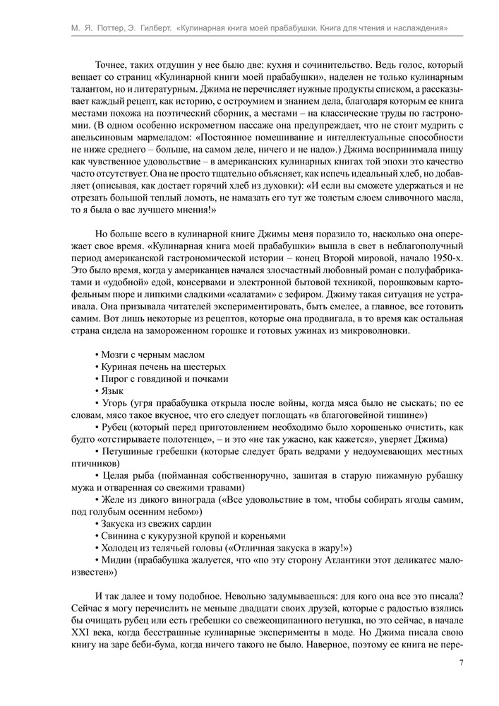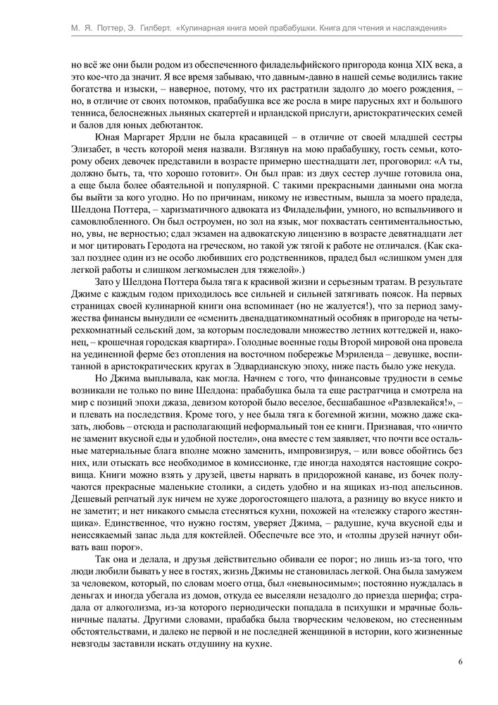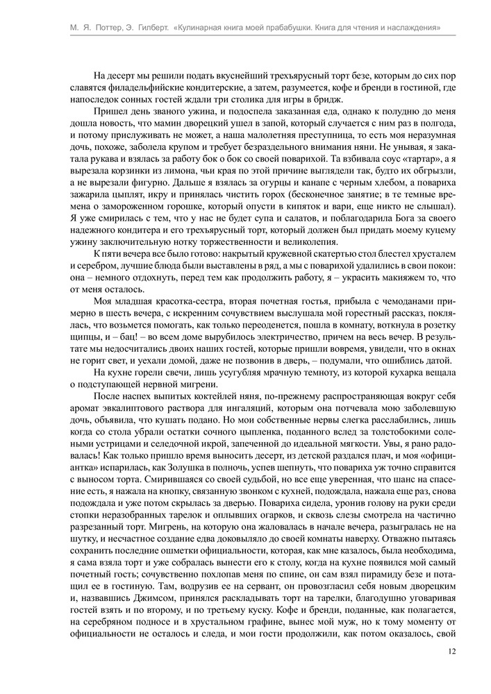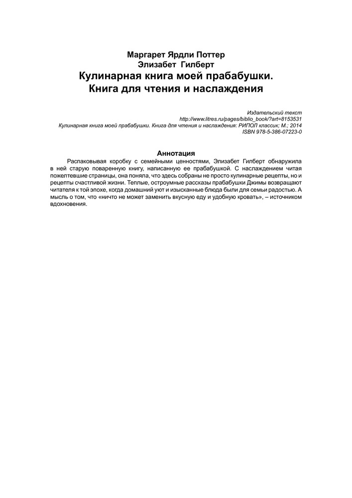 Кулинарная книга моей прабабушки. Книга для чтения и наслажденияМаргарет Ярдли Поттер, Элизабет Гилберт В данный момент этот товар отсутствует в продаже. Возможно, у нас найдется аналогичный или похожий товар здесь. Распаковывая коробку с семейными ценностями, Элизабет Гилберт обнаружила в ней старую поваренную книгу, написанную ее прабабушкой. С наслаждением читая пожелтевшие страницы, она поняла, что здесь собраны не просто кулинарные рецепты, но и рецепты счастливой жизни. Теплые, остроумные рассказы прабабушки Джимы возвращают читателя к той эпохе, когда домашний уют и изысканные блюда были для семьи радостью. |