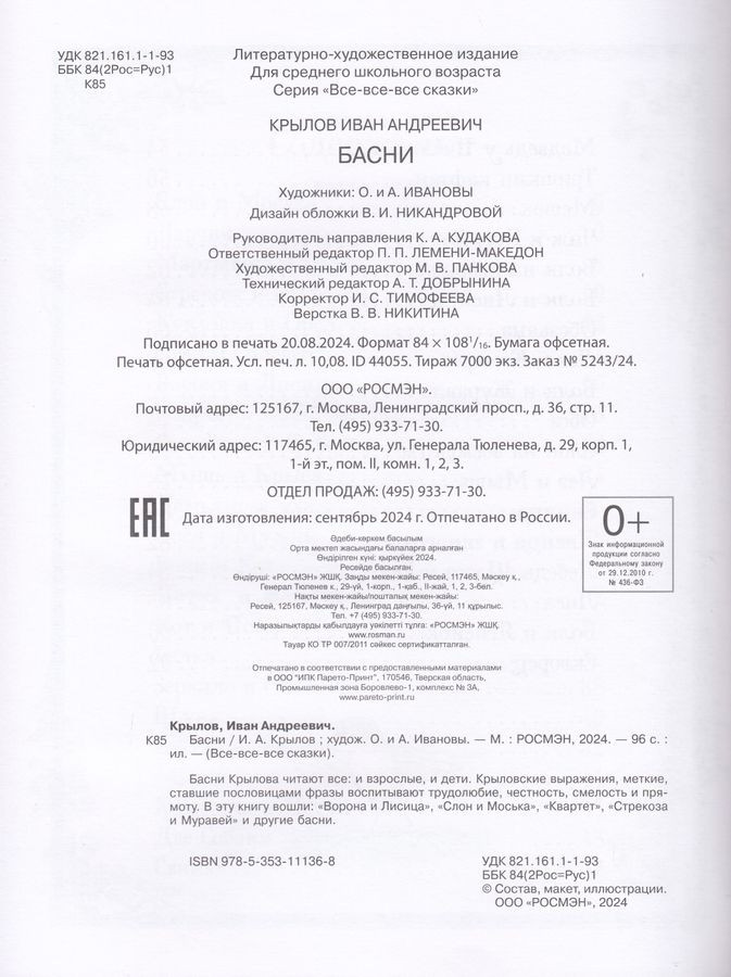 💳 Оплатить за товар можно при получении 🇰🇿 Есть бесплатная доставка по Казахстану 🎁 Копите бонусы с каждой покупки Серия: Все-все-все сказки Басни Крылова читают все: и взрослые, и дети. Крыловские выражения, меткие, ставшие пословицами фразы воспитывают трудолюбие, честность, смелость и прямоту. В эту книгу вошли: «Ворона и Лисица», «Слон и Моська», «Квартет», «Стрекоза и Муравей» и другие басни. |