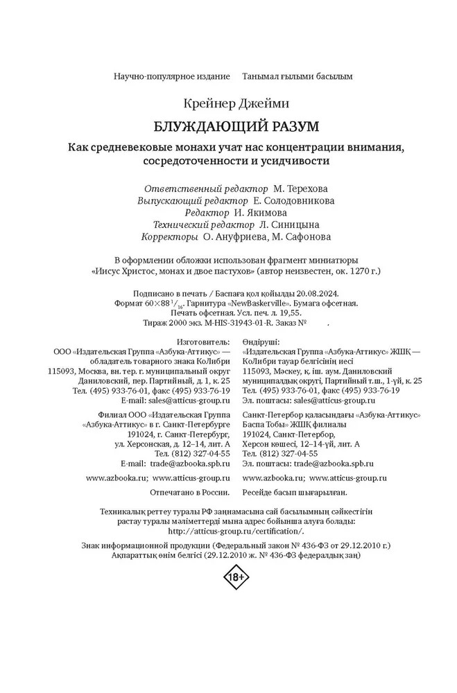 💳 Оплатить за товар можно при получении 🇰🇿 Есть бесплатная доставка по Казахстану от 1 дня 🎁 Копите бонусы с каждой покупки Серия: Исторический интерес Цифровая эпоха каждый день ставит перед нами преграды — отвлекающие факторы, которые мешают сосредоточиваться, сохранять концентрацию, оставаться внимательными. Окруженные со всех сторон экранами и технологиями, мы мечтаем сбежать от них, уйти в уединение подобно средневековым монахам. Однако монахам осознанность и сосредоточенность тоже давались нелегко. Известная исследовательница, эксперт с мировым именем Джейми Крейнер предлагает читателю погрузиться в жизнь раннехристианских монахов в эпоху Средневековья и показывает, как изо дня в день они противостояли соблазнам и вели сражение с рассеянностью, то проигрывая, то одерживая верх. |