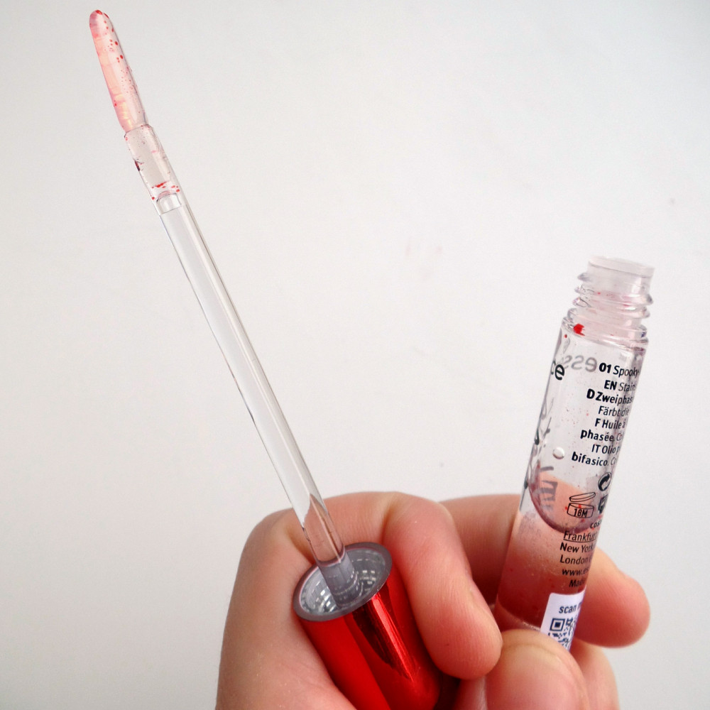Привлёк дизайн, в стиле пробирки с кровью. Вживую смотрится прикольно. На удивление мне понравилась отдушка (обычно у essence запахи мне не нравятся), пахнет арбузной жвачкой (хочется постоянно понюхать). На губах ощущается комфортно. Такой аппликатор мне попался впервые, но им вполне удобно наносить продукт. Недостаток только один - быстрый расход, надолго точно не хватит.