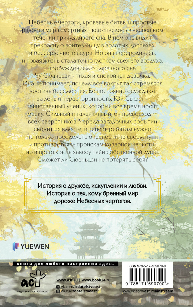 💳 Оплатить за товар можно при получении 🇰🇿 Есть бесплатная доставка по Казахстану от 1 дня 🎁 Копите бонусы с каждой покупки Серия: Хиты Китая. Фэнтези Небесные чертоги, кровавые битвы и простые радости мира смертных — всё сплелось в неспешном течении причудливого сна. В нём она видит прекрасную воительницу в золотых доспехах и бессердечного асура. Но она переродилась, и новая жизнь стала точно глотком свежего воздуха, пробуждением от мрачного сна. Чу Сюаньцзи — тихая и спокойная девочка. Она не понимает, почему все вокруг так стремятся достичь бессмертия. Её постоянно осуждают за лень и нерасторопность. Юй Сыфэн — таинственный ученик, который всё время носит маску. Сильный и талантливый, он превосходит всех сверстников. Череда загадочных событий сводит их вместе, и теперь ребятам нужно не только преодолеть опасности на своём пути и противостоять проискам коварной нечисти, но и приоткрыть завесу тайн собственной души. Сможет ли Сюаньцзи не потерять себя? История о дружбе, искуплении и любви. История о тех, кому бренный мир дороже Небесных чертогов. |