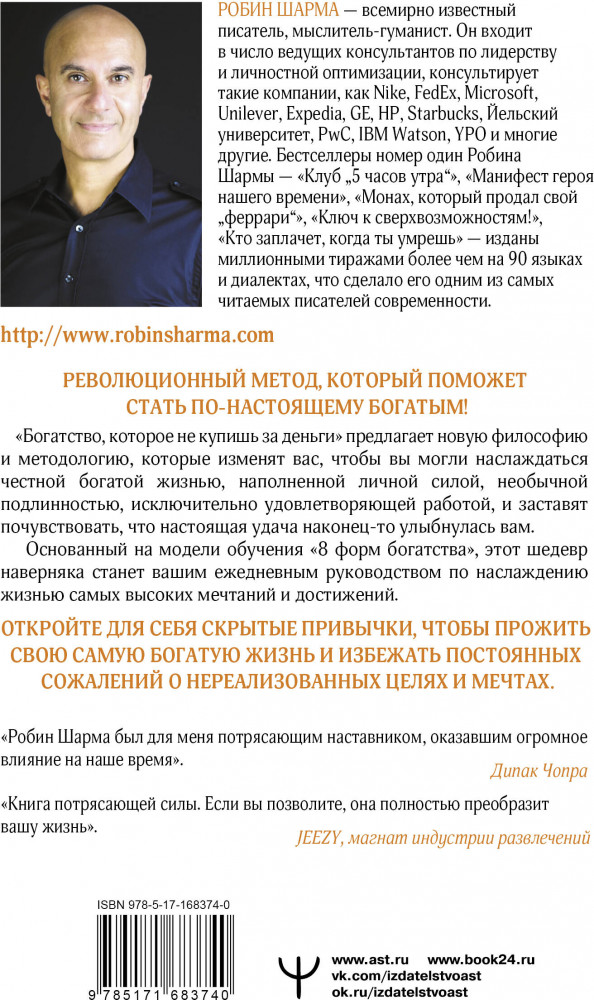 💳 Оплатить за товар можно при получении 🇰🇿 Есть бесплатная доставка по Казахстану 🎁 Копите бонусы с каждой покупки Серия: Шарма: Уроки мудрости Робин Шарма — всемирно известный писатель, мыслитель-гуманист. Он входит в число ведущих консультантов по лидерству и личностной оптимизации, его клиенты — знаменитые миллиардеры, деятели искусств, звезды профессионального спорта и многие компании из рейтинга «Fortune-100». Новаторская книга Робина Шармы по-новому раскрывает понятие богатства. Вы сможете жить богато и при этом оставаться собой. Откройте эту книгу, доверьтесь наставнику, и вы узнаете, какие восемь привычек присущи по-настоящему богатым людям, как создавать «идеальные моменты» для достижения целей, как наше счастье и процветание зависят от окружающих, и самое главное — как наши проблемы и недостатки можно превратить в источник для процветания и зарабатывания денег. |