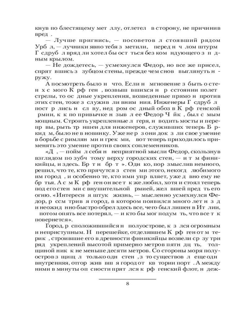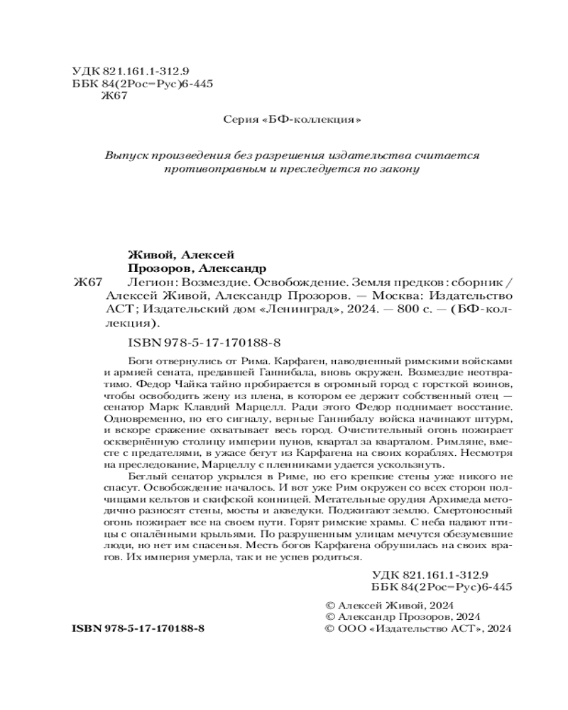💳 Оплатить за товар можно при получении 🇰🇿 Есть бесплатная доставка по Казахстану от 1 дня 🎁 Копите бонусы с каждой покупки Серия: Коллекция Боги отвернулись от Рима. Карфаген, наводненный римскими войсками и армией сената, предавшей Ганнибала, вновь окружен. Возмездие неотвратимо. Фёдор Чайка тайно пробирается в огромный город с горсткой воинов, чтобы освободить жену из плена, в котором ее держит собственный отец — сенатор Марк Клавдий Марцелл. Ради этого Фёдор поднимает восстание. Одновременно, по его сигналу, верные Ганнибалу войска начинают штурм, и вскоре сражение охватывает весь город. Очистительный огонь пожирает осквернённую столицу империи пунов, квартал за кварталом. Римляне вместе с предателями в ужасе бегут из Карфагена на своих кораблях. Несмотря на преследование, Марцеллу с пленниками удаётся ускользнуть. Беглый сенатор укрылся в Риме, но его крепкие стены уже никого не спасут. Освобождение началось. И вот уже Рим окружён со всех сторон полчищами кельтов и скифской конницей. Метательные орудия Архимеда методично разносят стены, мосты и акведуки. Поджигают землю. Смертоносный огонь пожирает всё на своём пути. Горят римские храмы. С неба падают птицы с опалёнными крыльями. По разрушенным улицам мечутся обезумевшие люди, но нет им спасенья. Месть богов Карфагена обрушилась на своих врагов. Их империя умерла, так и не успев родиться. |