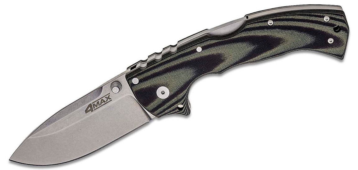 Cold Steel 4-Max — это мощный складной нож по дизайну Эндрю Демко, отличающийся высокой надёжностью и качеством материалов. Широкий клинок из японской стали AUS-10A в форме drop-point выдерживает значительные нагрузки, обладает хорошей проникающей способностью и устойчив к коррозии. Сталь AUS-10A, содержащая 1.2% углерода, сочетает высокую твёрдость (до 60 HRC) с гибкостью и износостойкостью.