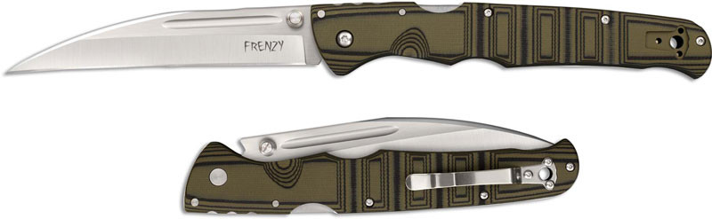 Мощный складной нож Cold Steel Frenzy I, S35VN выполнен по эскизам ножедела Эндрю Демко. При разработке его длинного и тонкого силуэта, мастер вдохновлялся образом традиционного японского меча Кабутовари, давшего ножу Frenzy не только свой дух, но и боевую мощь. Острый клинок длиною 14 см выполнен из отменной американской стали CPM S35VN. Твердость материала достигает 60-62 HRC, а финишная обработка сатинированием — придает спускам блестящую равномерную поверхность.