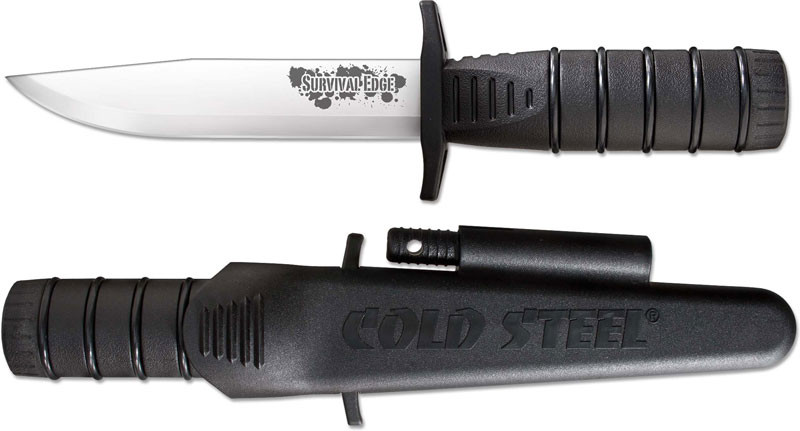 Survival Edge — легкий и прочный нож от Cold Steel, предназначенный решать любые задачи в условиях выживания. Рукоять ножа изготовлена из полипропилена высокого качества и имеет полезную емкость внутри, содержащую набор для выживания, в который входит: набор рыболовных крючков, свисток, булавки, грузила, проволока, леска, компас, искусственные наживки. Также, в комплект входят ножны с огнивом.