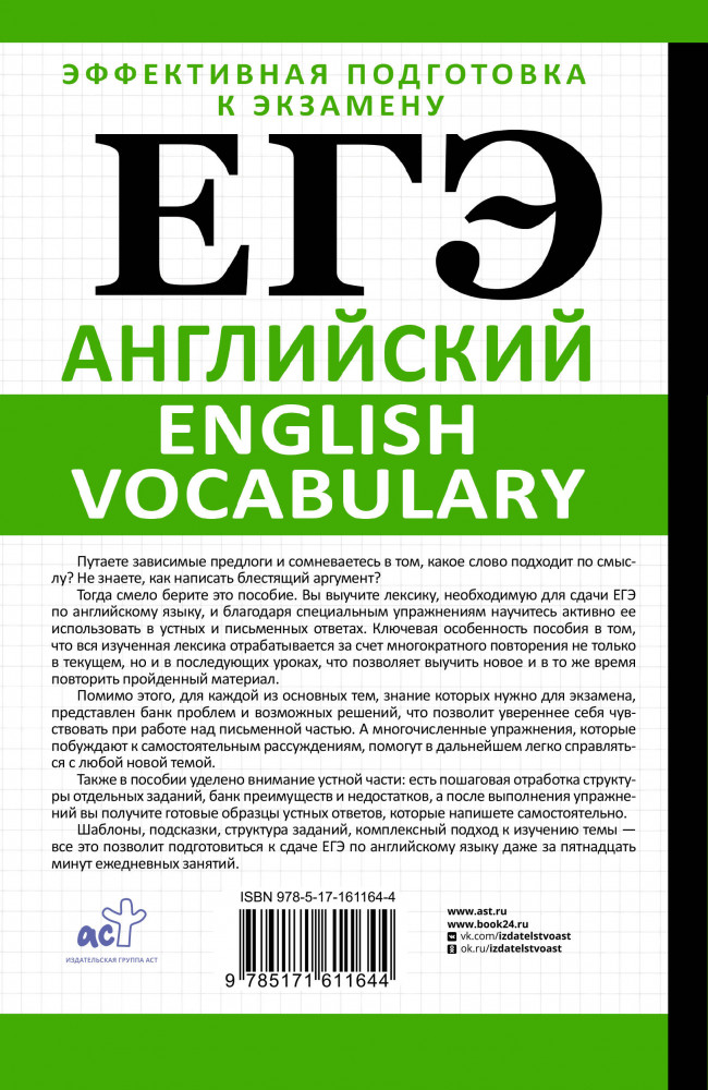 💳 Оплатить за товар можно при получении 🇰🇿 Есть бесплатная доставка по Казахстану от 1 дня 🎁 Копите бонусы с каждой покупки Серия: Сам себе репетитор. Подготовка за 15 минут Путаете зависимые предлоги и сомневаетесь в том, какое слово подходит по смыслу? Не знаете, как написать блестящий аргумент? Тогда смело берите это пособие. Вы выучите лексику, необходимую для сдачи ЕГЭ по английскому языку, и благодаря специальным упражнениям научитесь активно ее использовать в устных и письменных ответах. Ключевая особенность пособия в том, что вся изученная лексика отрабатывается за счет многократного повторения не только в текущем, но и в последующих уроках, что позволяет выучить новое и в то же время повторить пройденный материал. Помимо этого, для каждой из основных тем, знание которых нужно для экзамена, представлен банк проблем и возможных решений, что позволит увереннее себя чувствовать при работе над письменной частью. А многочисленные упражнения, которые побуждают к самостоятельным рассуждениям, помогут в дальнейшем легко справляться с любой новой темой. |