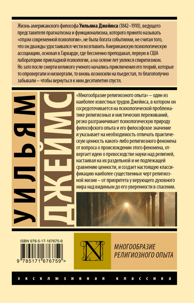 Многообразие религиозного опытаВ данный момент этот товар отсутствует в продаже. Возможно, у нас найдется аналогичный или похожий товар здесь. Серия: Эксклюзивная классика Жизнь американского философа Уильяма Джеймса (1842—1910), ведущего представителя прагматизма и функционализма, которого принято называть «отцом современной психологии», не была богата событиями, не считая того, что он дважды удостаивался чести возглавить Американскую психологическую ассоциацию, основал в Гарварде, где бессменно преподавал, первую в США лабораторию прикладной психологии, а на склоне лет увлекся спиритизмом. Но зато после смерти великого ученого начались приключения его теорий, которые то опровергали и низвергали, то вновь возносили на пьедестал, то благополучно забывали — чтобы вернуться к ним десятилетия спустя. |