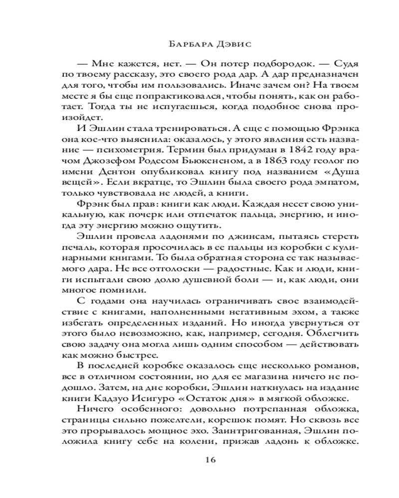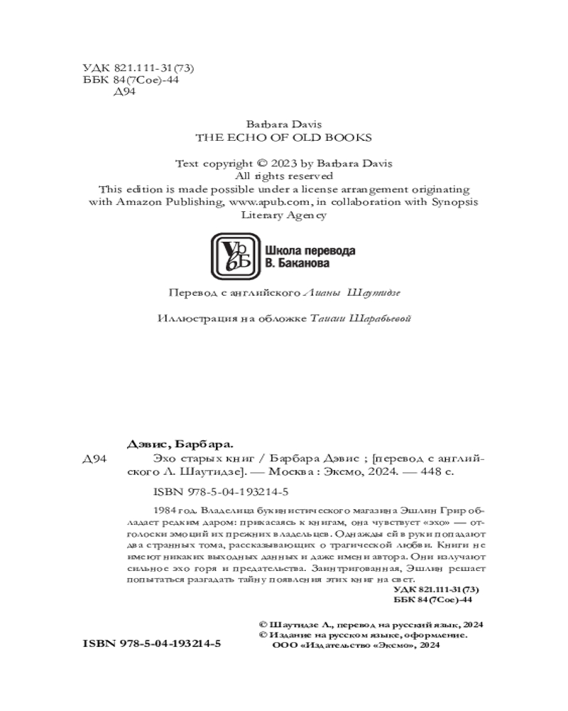 💳 Оплатить за товар можно при получении 🇰🇿 Есть бесплатная доставка по Казахстану от 1 дня 🎁 Копите бонусы с каждой покупки Серия: Novel. Мировые хиты Барбары Дэвис (новое оформление) 1984 год. Владелица букинистического магазина Эшлин Грир обладает редким даром: прикасаясь к книгам, она чувствует «эхо» — отголоски эмоций их прежних владельцев. Однажды ей в руки попадают два странных тома, рассказывающих о трагической любви. Книги не имеют никаких выходных данных и даже имени автора. Они излучают сильное эхо горя и предательства. Заинтригованная Эшлин решает попытаться разгадать тайну появления этих книг на свет. |