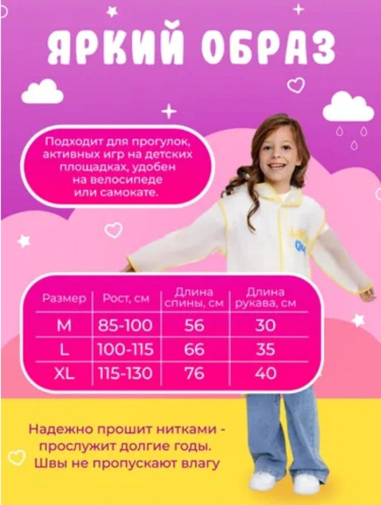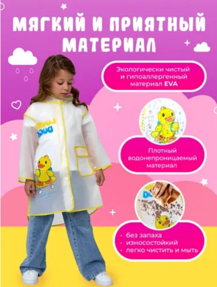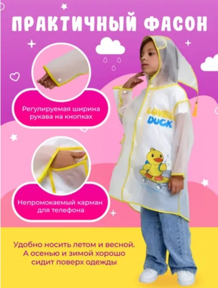 Плащ с капюшоном и козырьком станет незаменимым атрибутом в гардеробе вашего ребенка. Верхняя одежда обеспечивает надежную защиту от влаги. Плащ украшен милыми 3D-рисунками. Подходит для девочек и мальчиков, подчеркнет их стиль и добавит ярких красок в пасмурные дни. Легкий плащ дождевик — одежда комфортная и практичная, способная выдержать активные игры на природе. Дождевик подходит детям разного возраста и станет отличным выбором для прогулок. Этот тип верхней одежды легкий и компактный, его можно легко сложить и носить с собой!