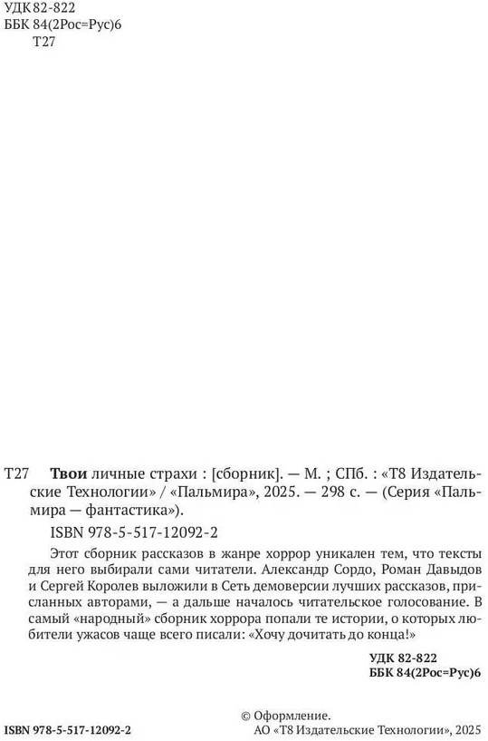 💳 Оплатить за товар можно при получении 🇰🇿 Есть бесплатная доставка по Казахстану от 1 дня 🎁 Копите бонусы с каждой покупки Серия: Пальмира — Фантастика Этот сборник рассказов в жанре хоррор уникален тем, что тексты для него выбирали сами читатели. Александр Сордо, Роман Давыдов и Сергей Королев выложили в Сеть демоверсии лучших рассказов, присланных авторами, — а дальше началось читательское голосование. В самый «народный» сборник хоррора попали те истории, о которых любители ужасов чаще всего писали: «Хочу дочитать до конца!» |