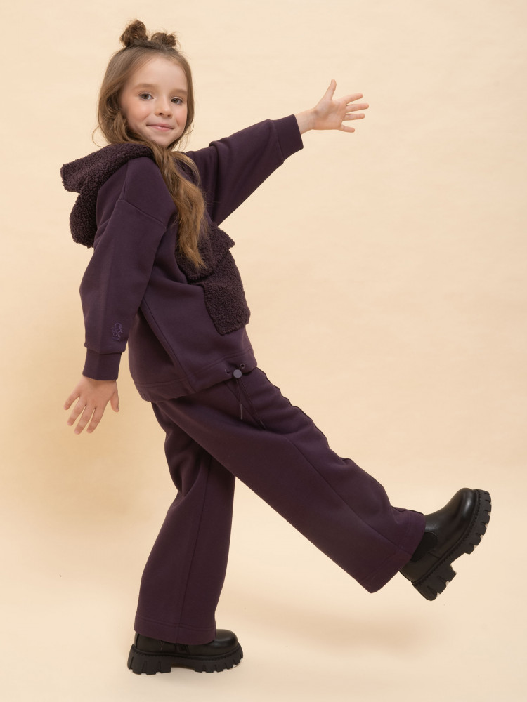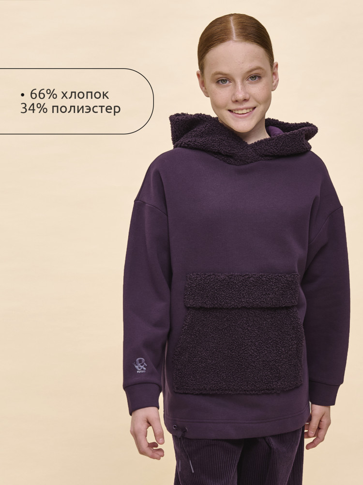 Худи детское для девочки актуального оверсайз-силуэта со спущенным плечом подарит ребёнку комфорт и не будет сковывать его движений. Трендовое сочетание разных фактур — футера с начёсом и искусственного меха — поможет создать стильный и одновременно уютный образ. Худи с капюшоном из искусственного меха с подкладкой из мягкого хлопка может заменить ветровку. Большой и удобный накладной карман по переду также выполнен из искусственного меха с приятной на ощупь фактурой барашка. По низу утяжка с пластиковым стоппером — можно регулировать ширину и посадку худи.