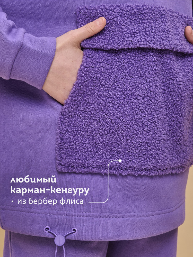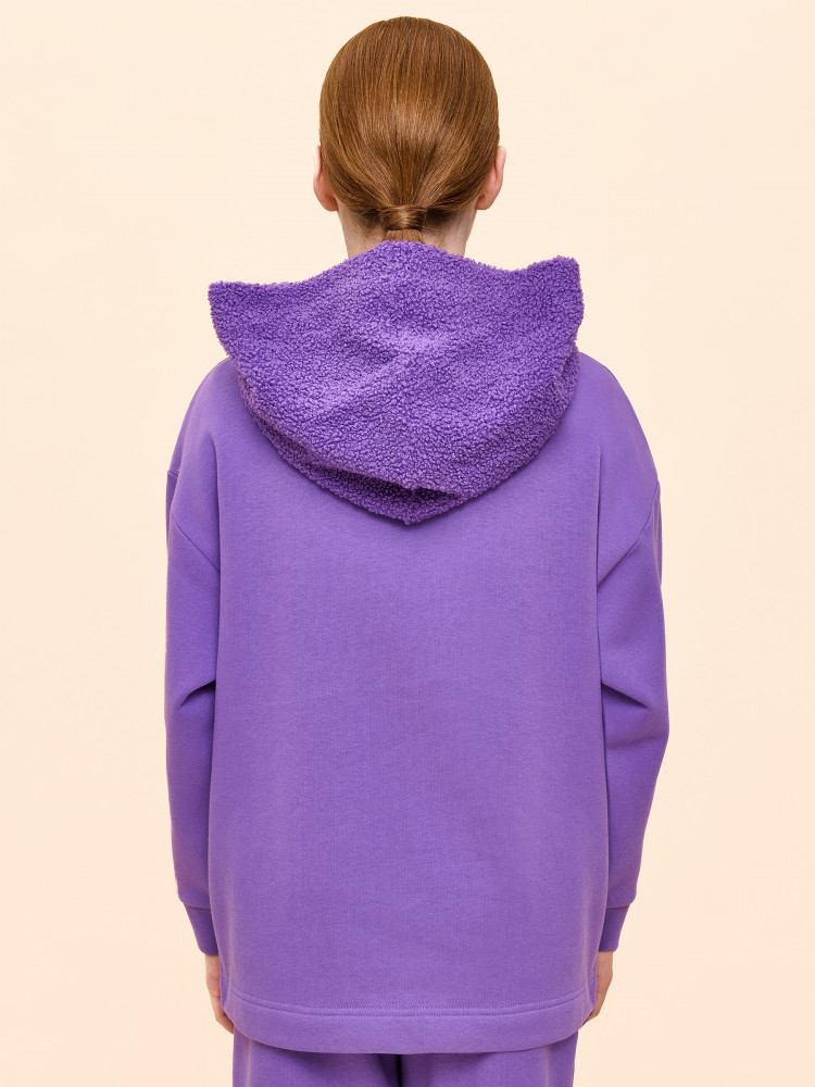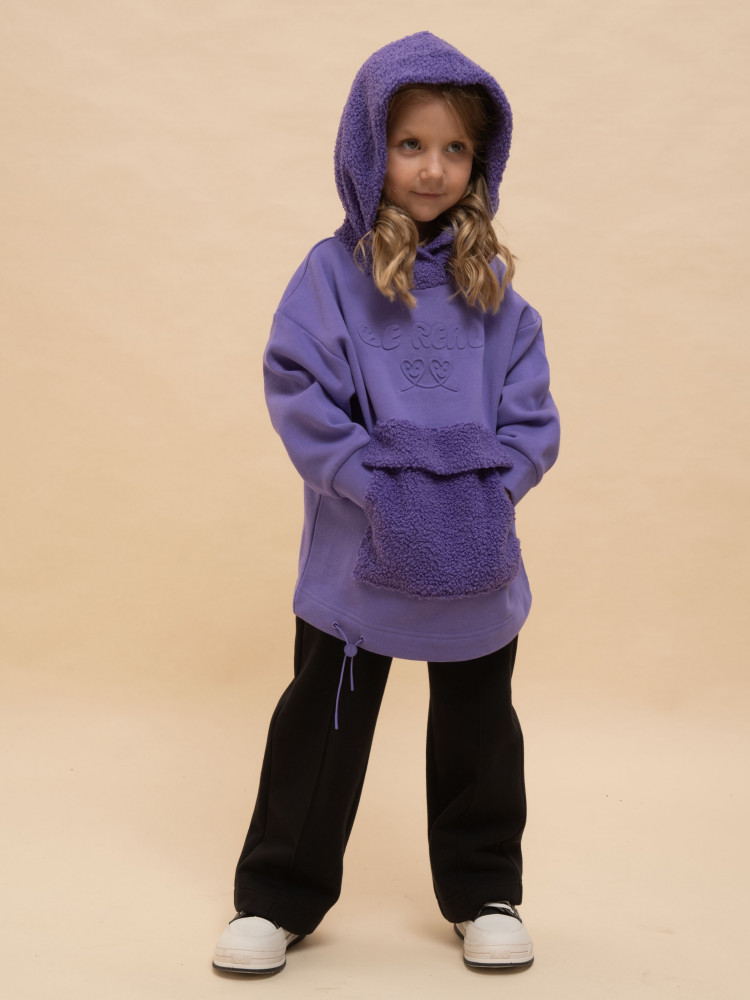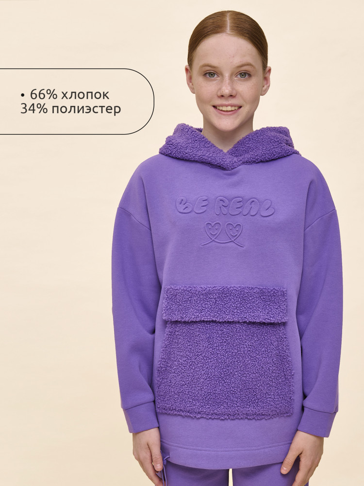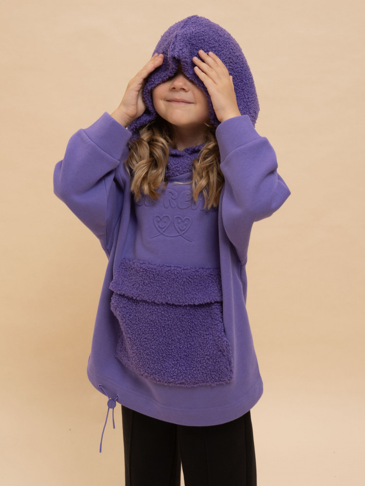 Худи детское для девочки актуального оверсайз-силуэта со спущенным плечом. Трендовое сочетание разных фактур — футера с начёсом и искусственного меха — поможет создать стильный и одновременно уютный образ. Худи с капюшоном из искусственного меха с подкладкой из мягкого хлопка может заменить ветровку. Большой и удобный накладной карман по переду также выполнен из искусственного меха с приятной на ощупь фактурой барашка. По низу утяжка с пластиковым стоппером — можно регулировать ширину и посадку худи.