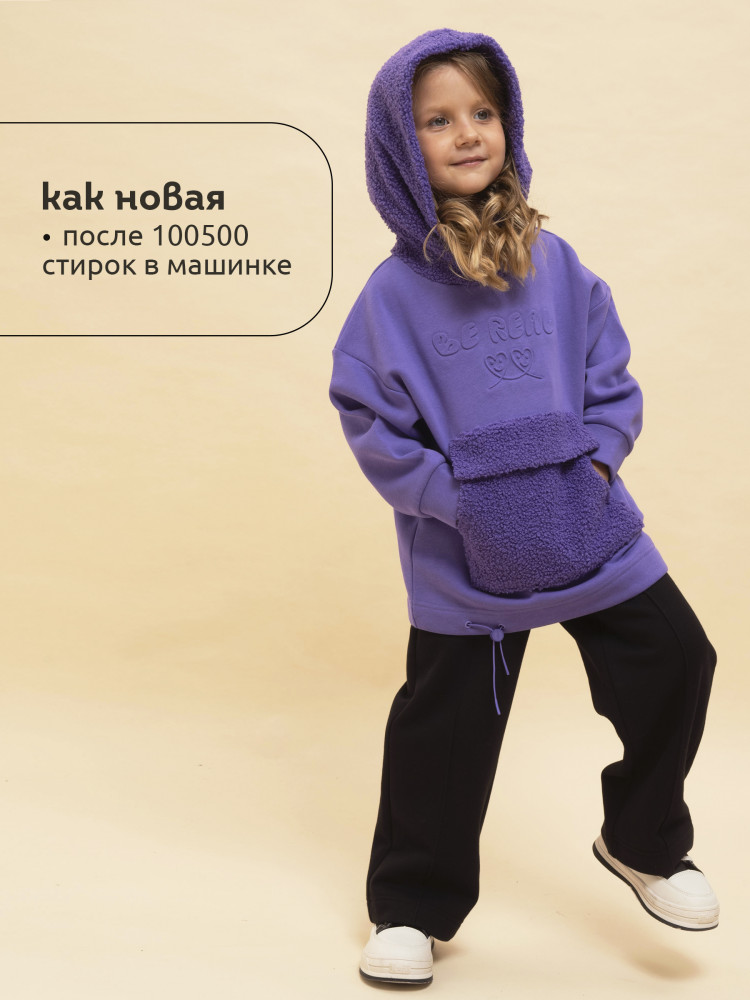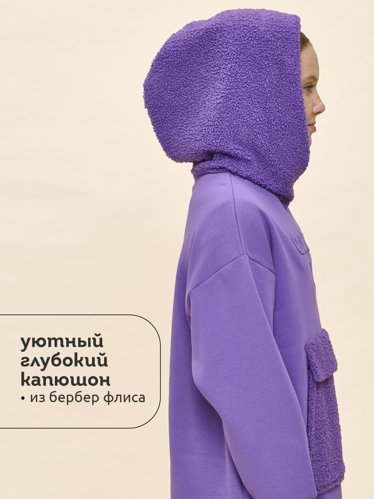 Худи детское для девочки актуального оверсайз-силуэта со спущенным плечом. Трендовое сочетание разных фактур — футера с начёсом и искусственного меха — поможет создать стильный и одновременно уютный образ. Худи с капюшоном из искусственного меха с подкладкой из мягкого хлопка может заменить ветровку. Большой и удобный накладной карман по переду также выполнен из искусственного меха с приятной на ощупь фактурой барашка. По низу утяжка с пластиковым стоппером — можно регулировать ширину и посадку худи.