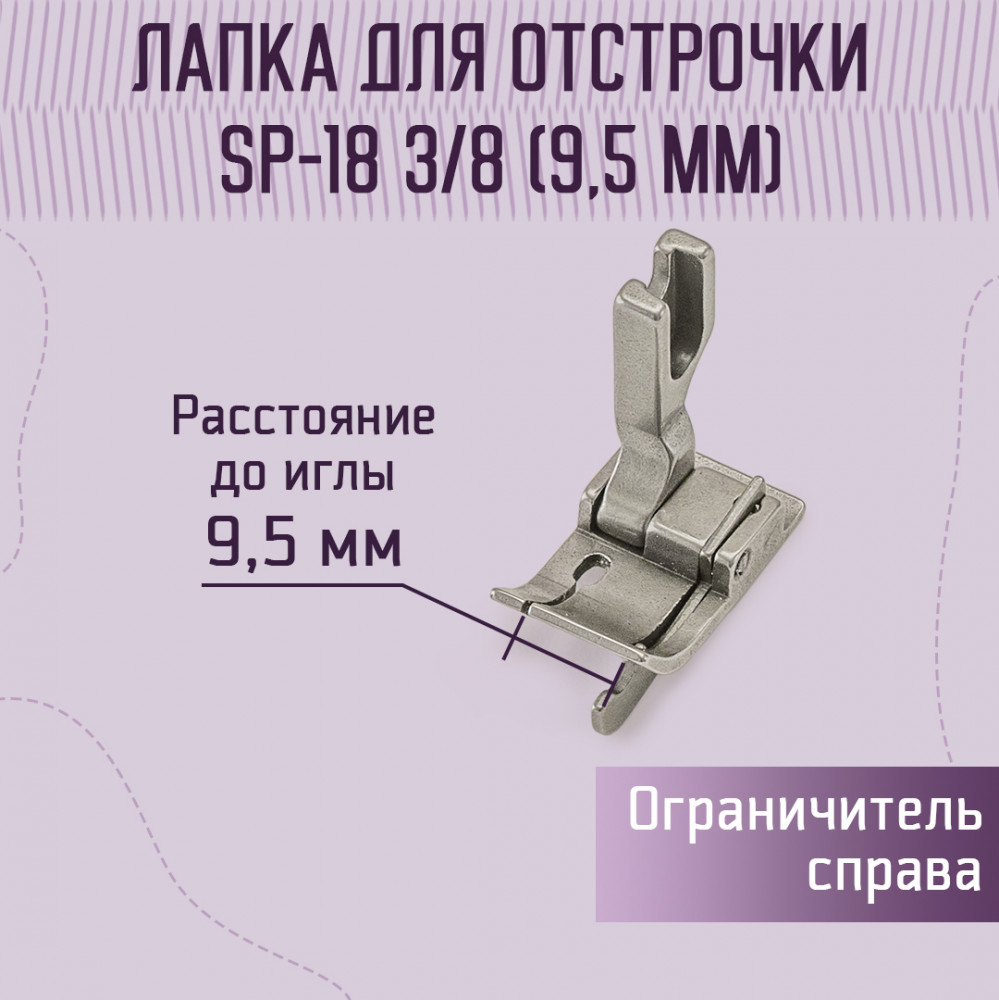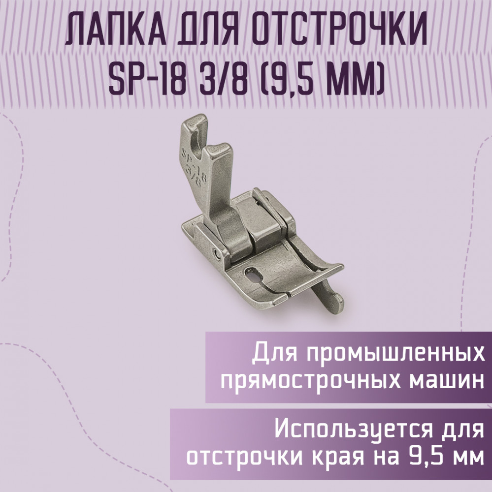 Yoke Лапка для отстрочки SP-18 3/8" (9.5 мм)В данный момент этот товар отсутствует в продаже. Возможно, у нас найдется аналогичный или похожий товар здесь. Лапка SP-18, предназначена для отстрачивания края материала с ограничителем, который удерживает край ткани на нужном расстоянии ограничителем-флажком для ровной параллельной отстрочки шва. Подходит для одноигольных прямострочных швейных машин с нижним продвижением ткани. Лапка SP-18 служит для отстрочки края изделия во время прокладки стачивающего или отделочного шва на определенное расстояние от края. Расстояние отстрочки SP-18 3/8 составляет 9,5 мм. Подходит только для промышленных одноигольных прямострочных машин. Указанный размер лапки — это расстояние стачивающего или отделочного шва от края справа. С их помощью можно выполнить аккуратную отделочную строчку. Ограничитель способствует ровному продвижению ткани, не стягивая при шитье и не препятствует продвижению. Также с этой лапкой легко и просто создать строчку на необходимом расстоянии от края изделия. Лапку с ограничителем применяют, когда нужно расстрочить изделие, прошить срезы и выполнить потайные швы. Она незаменима для создания классических и декоративных видов стежков, соединения деталей с заданной шириной припуска. |