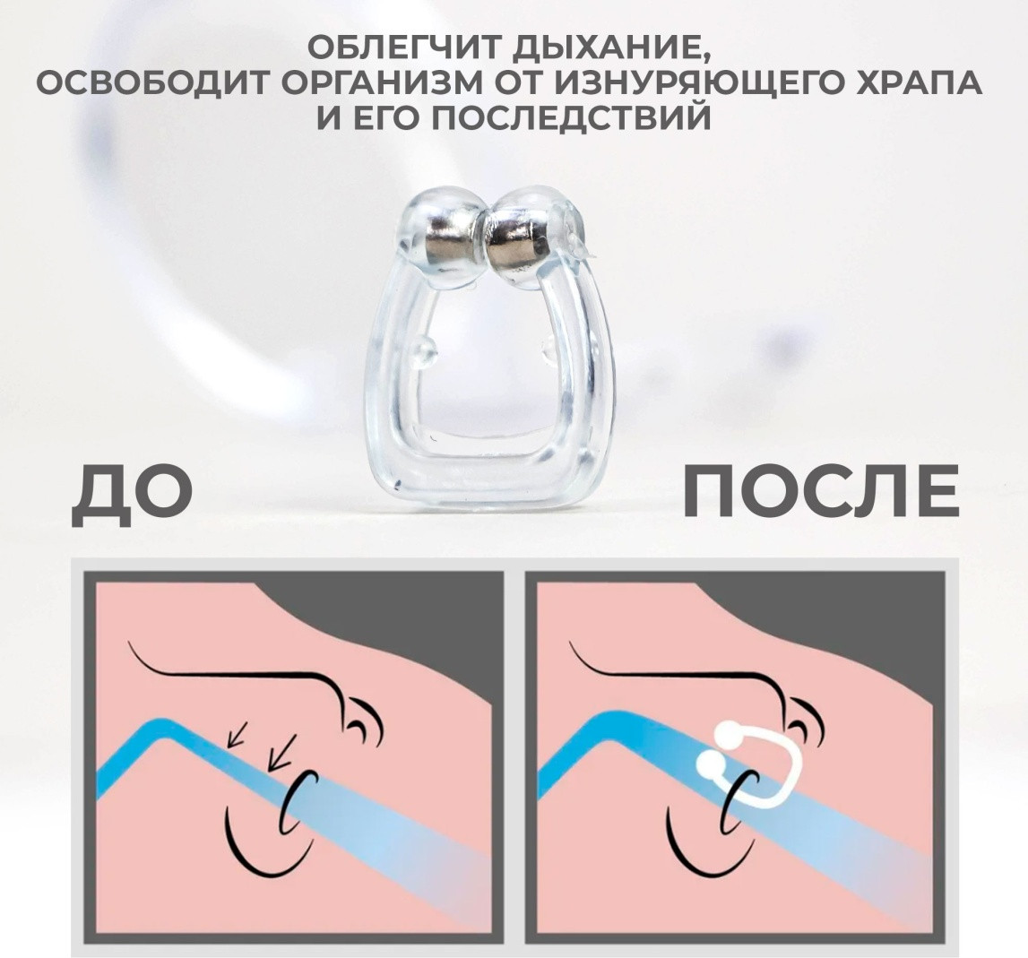 Силиконовый зажим от храпа с магнитными наконечниками — это простое и эффективное устройство, которое помогает уменьшить храп и улучшить качество сна. Этот зажим изготовлен из мягкого медицинского силикона высочайшего качества, гипоаллергенного и полностью безопасного для здоровья. Маленький и незаметный, зажим легко устанавливается и не вызывает дискомфорта.