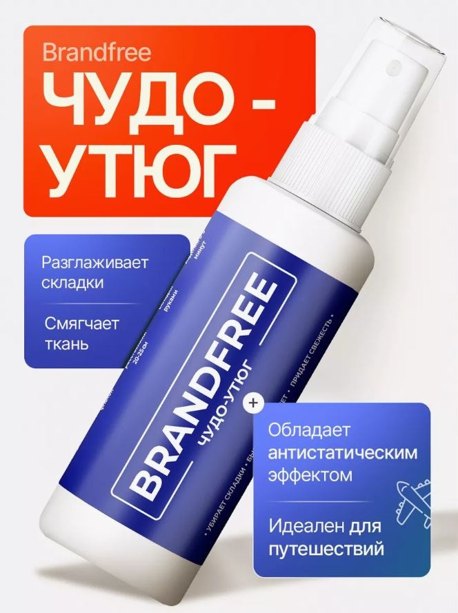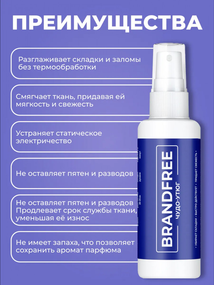 Мини-флакон объемом 100 мл легко помещается в сумку, что делает его удобным для использования в дороге, на отдыхе и в путешествии. Положите маленький флакон антистатика в машину, и он выручит вас в самый нужный момент. Чудо-утюг Брандфри прост в применении и наверняка пригодится в школе, в офисе и в университете. Для достижения быстрого результата достаточно распылить спрей на ткань до увлажнения, разгладить руками и дать высохнуть — средство зафиксирует волокна в разглаженном состоянии.